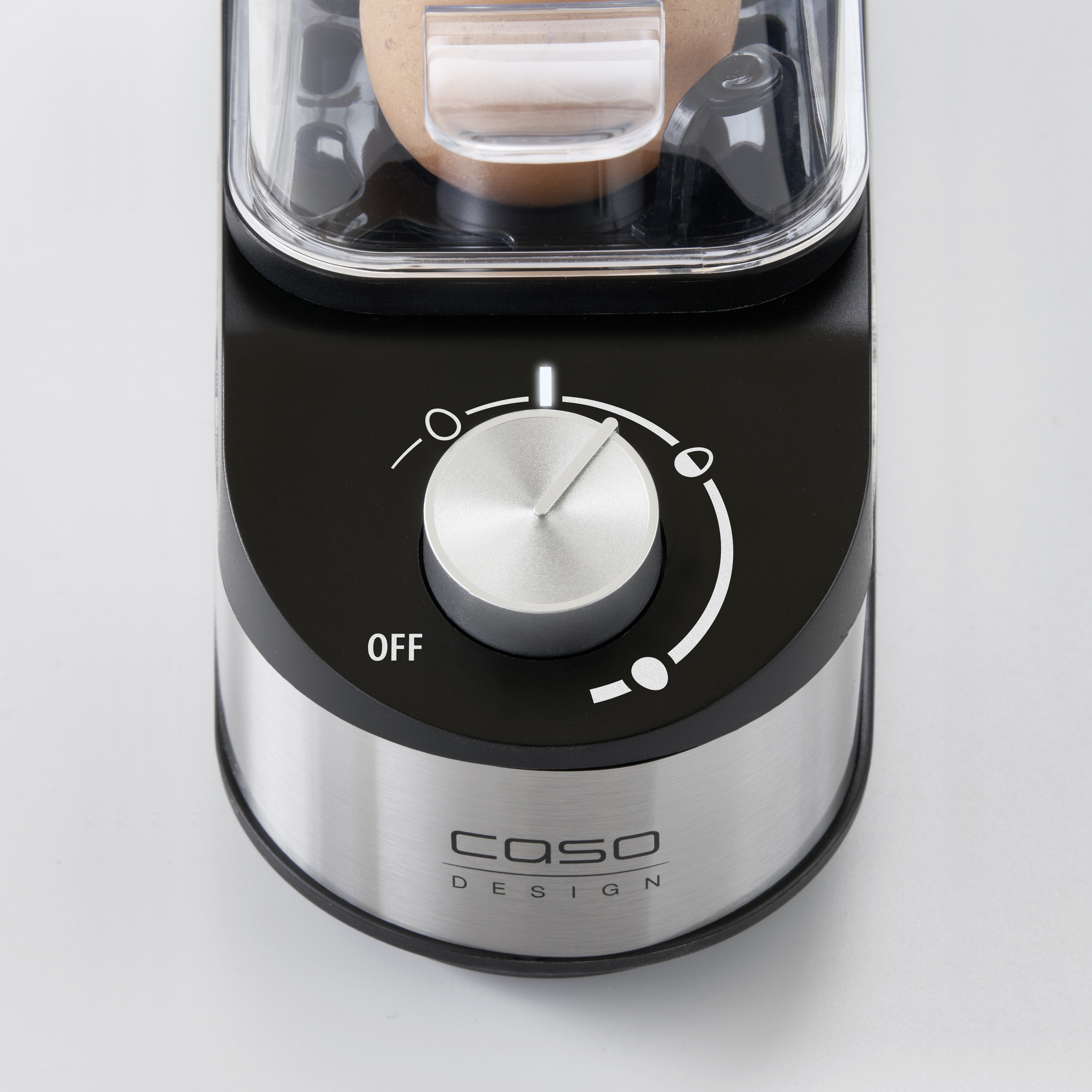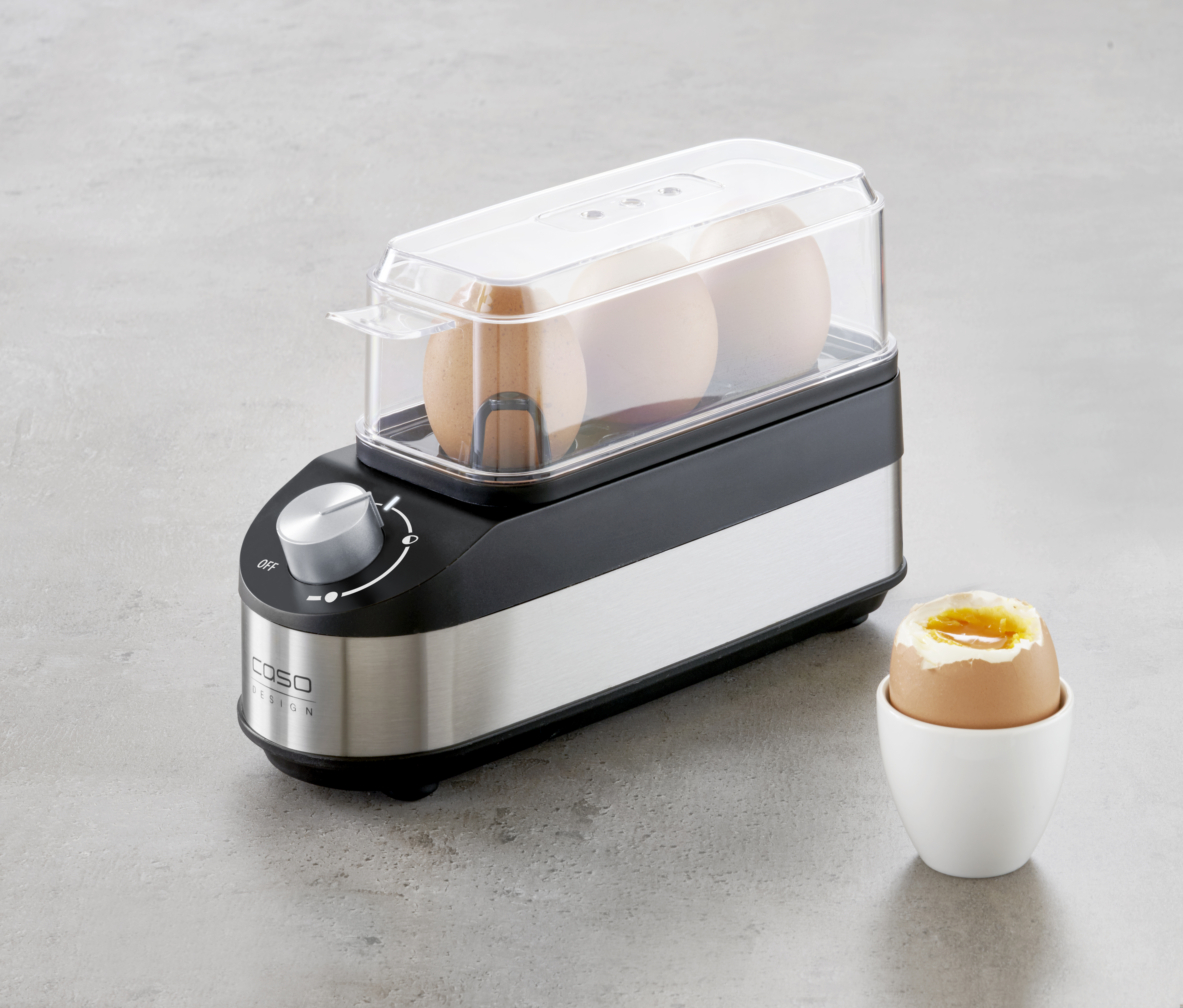 Egg boiler for up to 3 eggs; Electronic control of boiling time, no water measuring required; Infinitely variable control knob for the desired degree of hardness from soft to hard (boiling time up to 15 mins); White LED indicates the operating mode; Automatic switch-off with acoustic signal at the end of boiling time