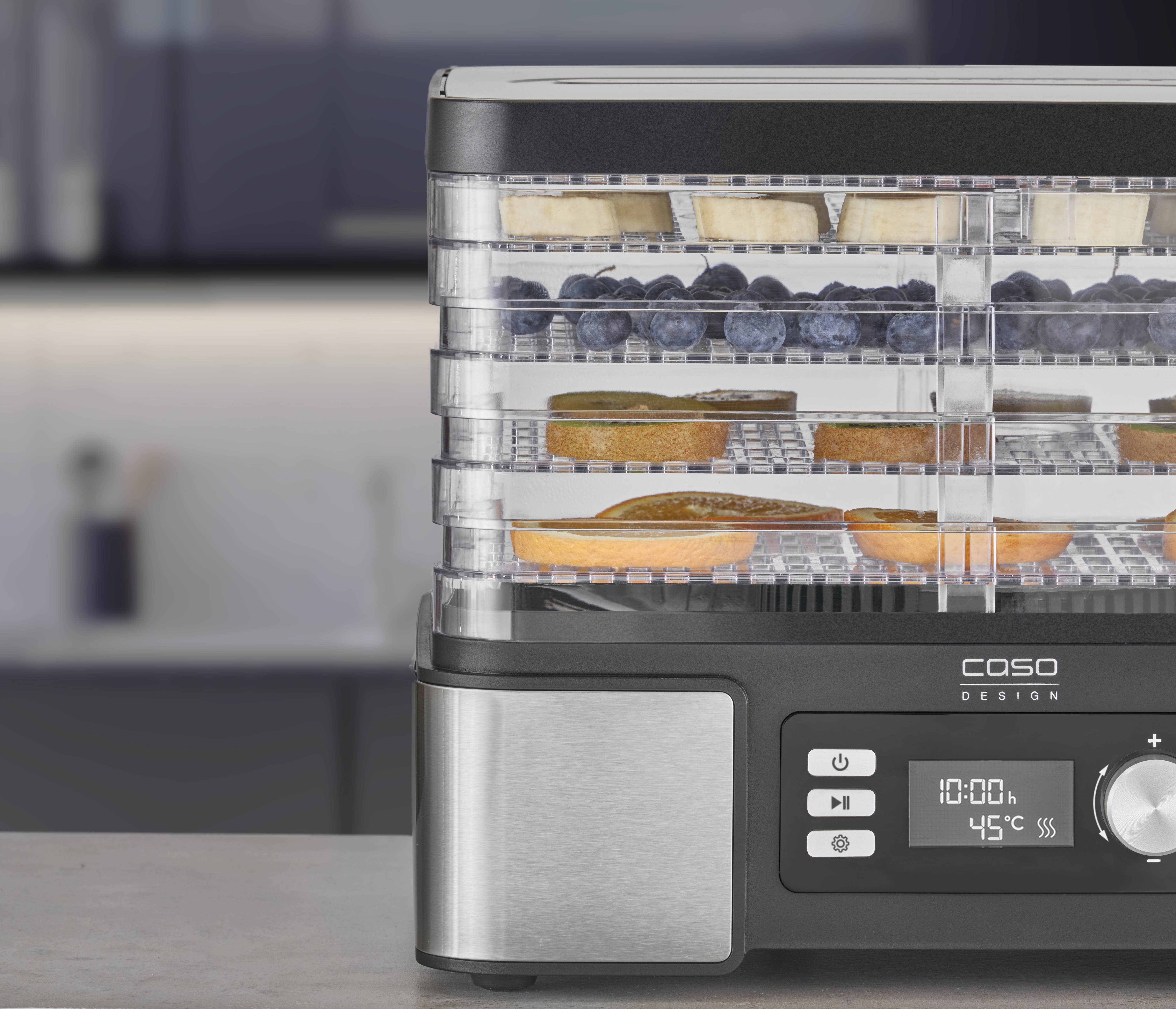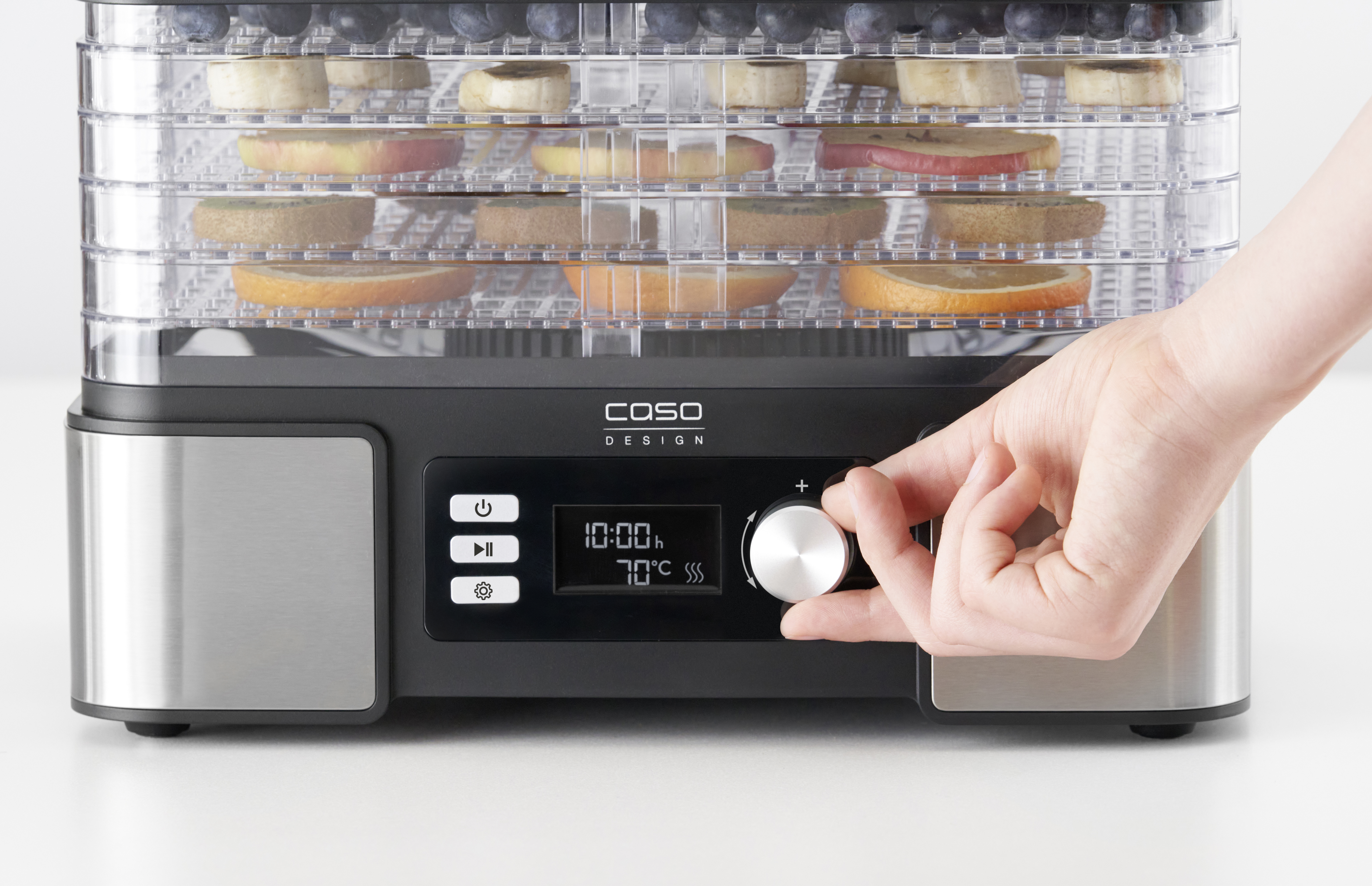 White LED screen with temperature and time display; Cover and base in high-quality stainless steel; Practical timer adjustable from 0.5 ‐ 48 hours (in 0.5 h increments) with acoustic signal when the time is up; Plenty of space thanks to 5 stackable, height-adjustable drying racks