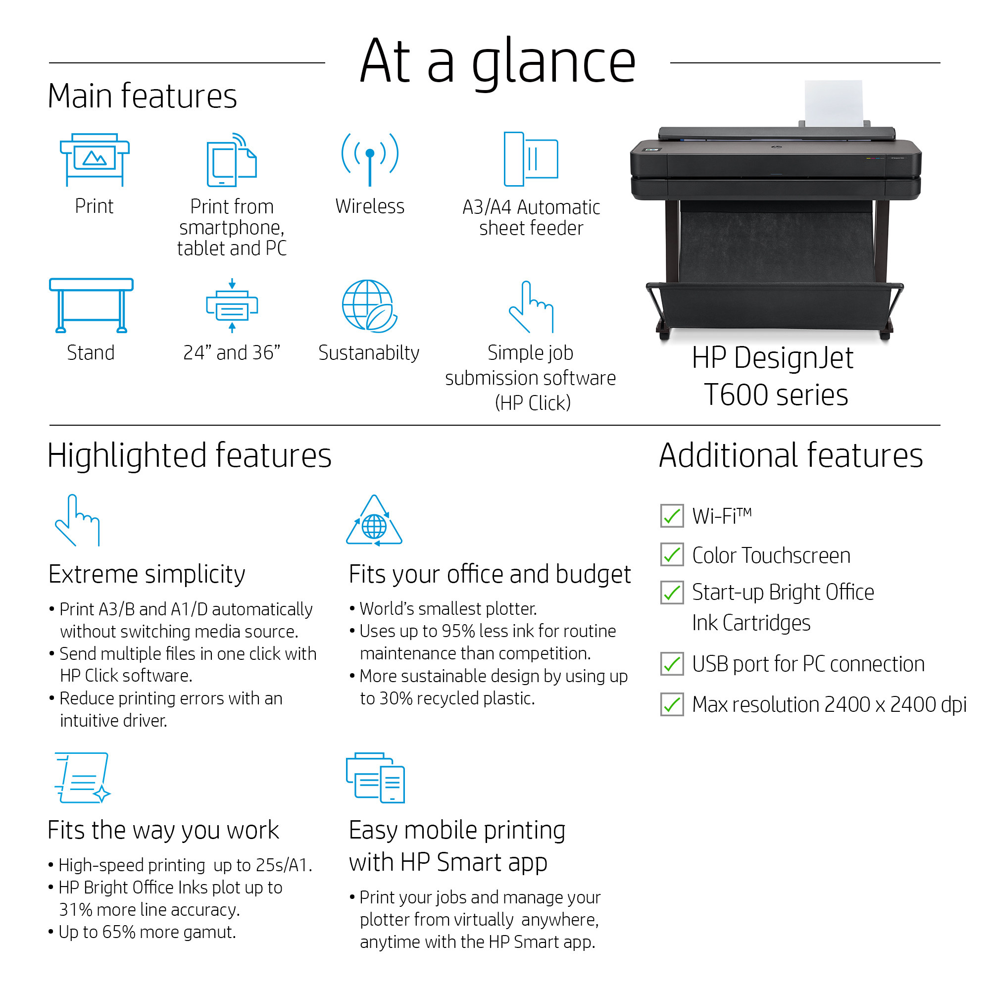 HP DesignJet T650 Printer/Plotter 2025 edition - 36" Roll/A4,A3,A2,A1,A0 Color Ink, Print, Auto Sheet Feeder, Auto Horizontal Cutter, LAN, WiFi, 25 sec/A1 page, 82 A1 prints/hour, with Stand, 2 years