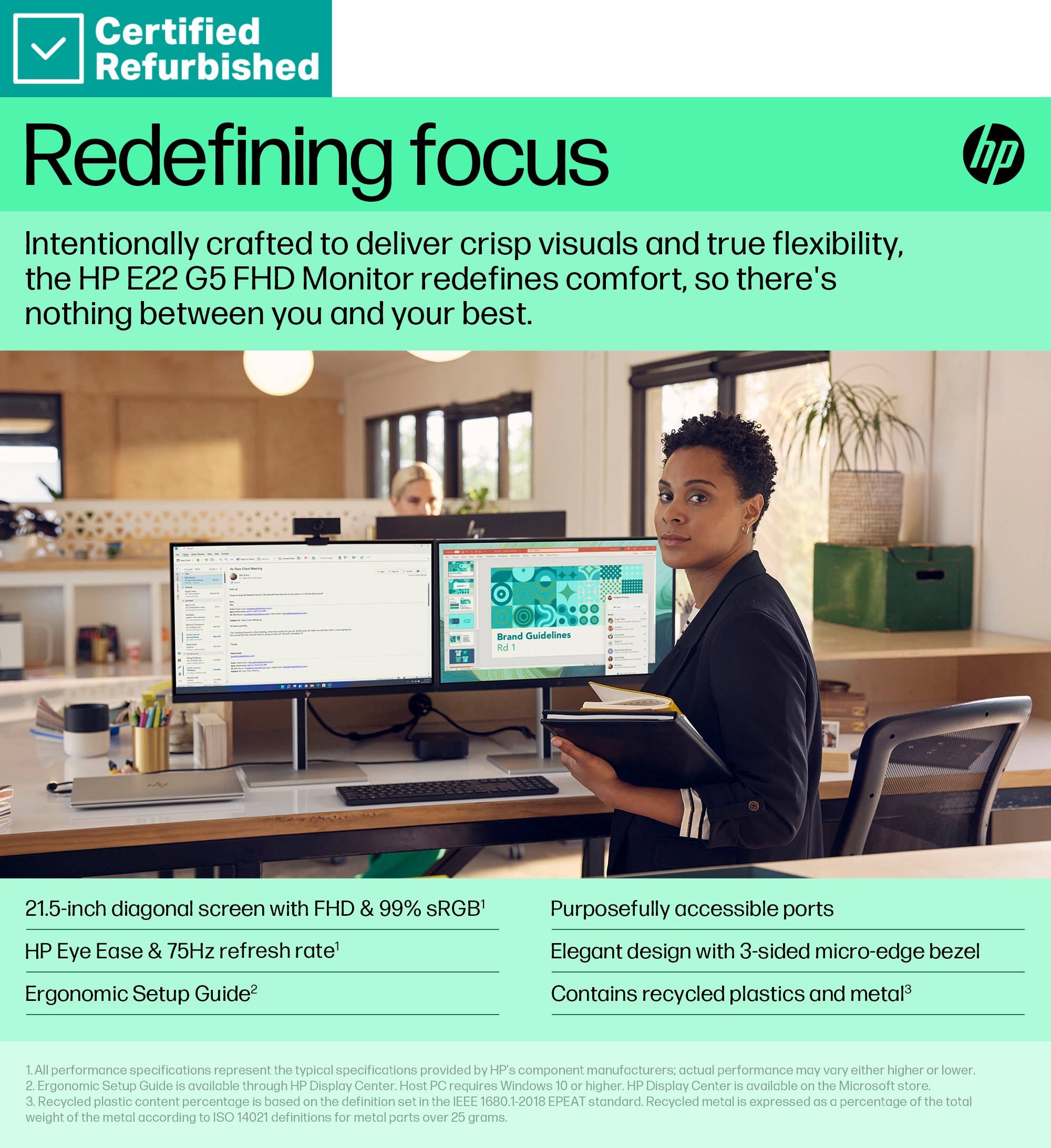 • When the difference is in the details, this 21.5-inch diagonal FHD monitor displays the clarity you need to stay focused on the task at hand with 99% sRGB color depth and IPS technology[1].