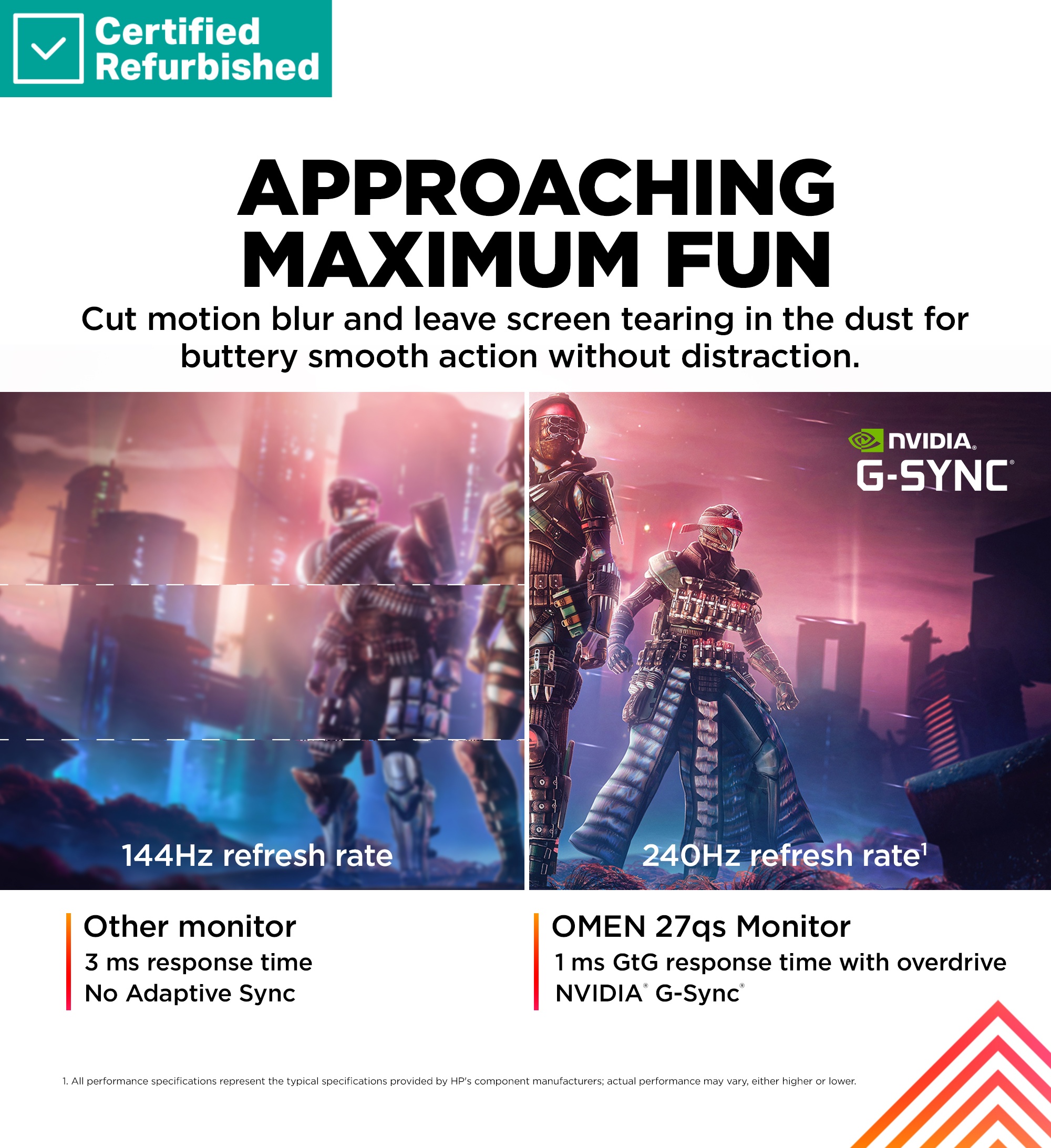 • Frame by frame, experience buttery smooth action with 240Hz refresh rate and 1ms GTG response time with Overdrive[1], this gaming monitor leaves screen tearing and lag in the dust, thanks to NVIDIA G-SYNC compatibility.