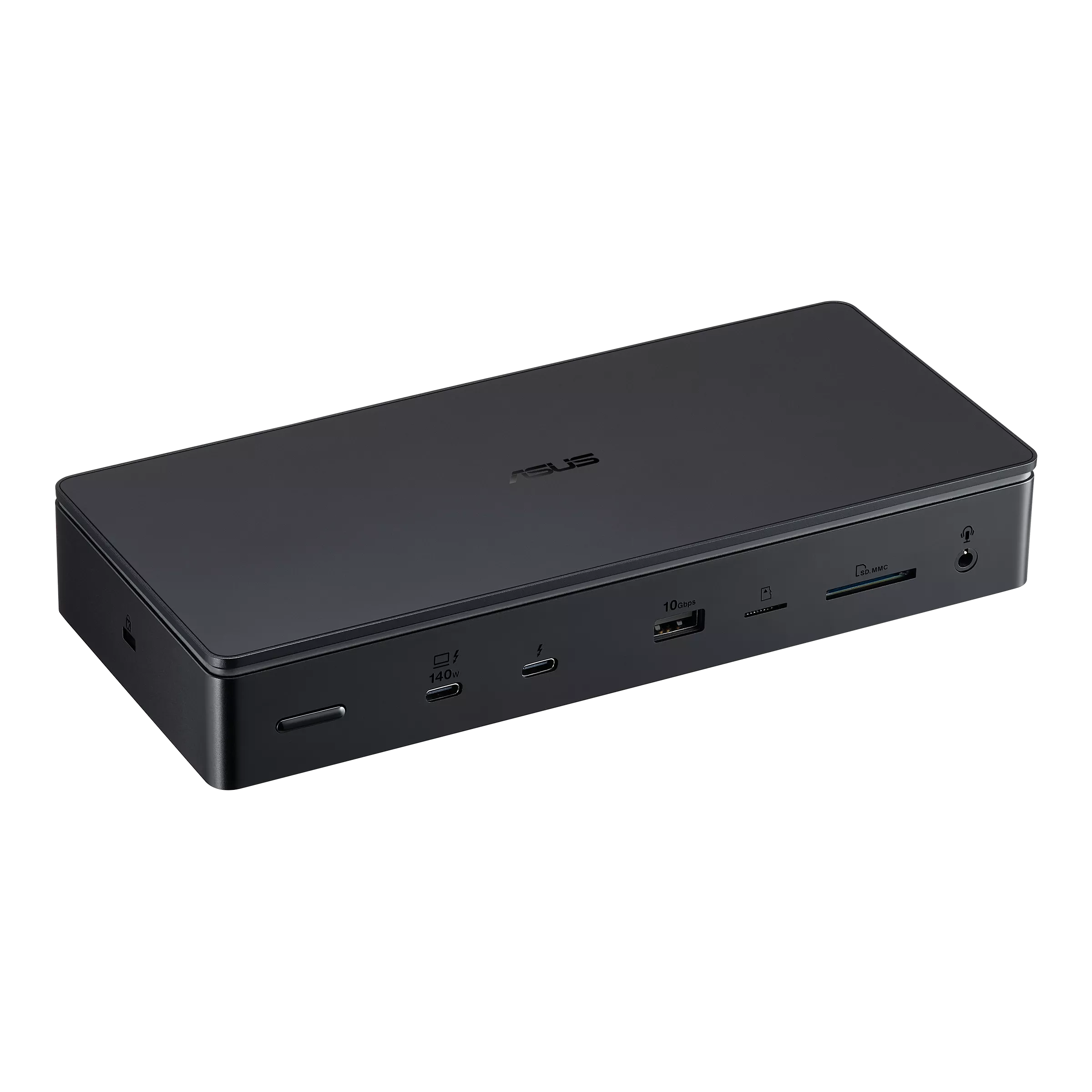 ASUS Master Thunderbolt™ 5 Dock is a 13-in-1 dock designed for creators, giving them the ability to turn their laptop into a powerful workstation with just a single cable connection. The dock is able to support up to three 4K displays, super 80Gbps data transfer speed via three Thunderbolt 5, read two memory cards, and even includes an SSD slot for additional storage. Built-in LEDs on the underside of the device offer adjustable ambient lighting to add a futuristic aesthetic to any creative space.