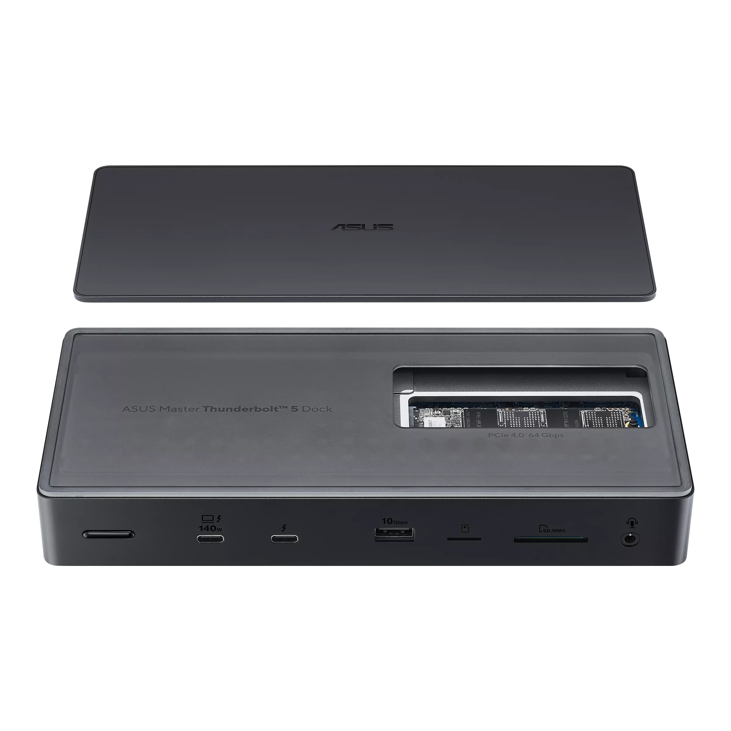 The toolless-access design of ASUS Master Thunderbolt 5 Dock includes a magnetic top cover that can be removed to reveal the concealed M.2 NVMe® PCIe® 4.0 SSD slot for quick and easy storage upgrades and installation without the need for any tools. The slot enables supports up to 64Gbps transfer speeds — twice that of Thunderbolt™ 4 — for efficient handling of large files.