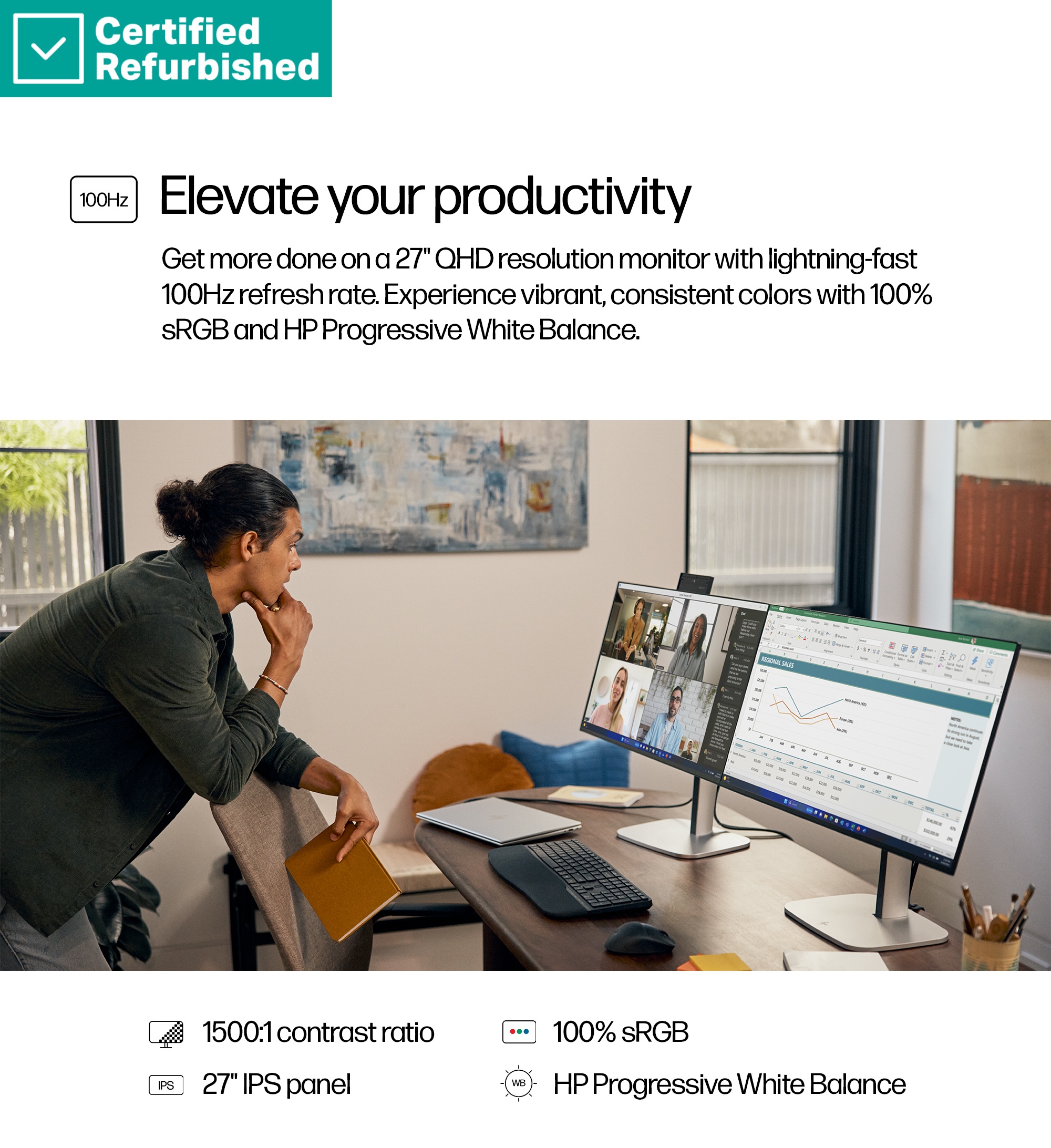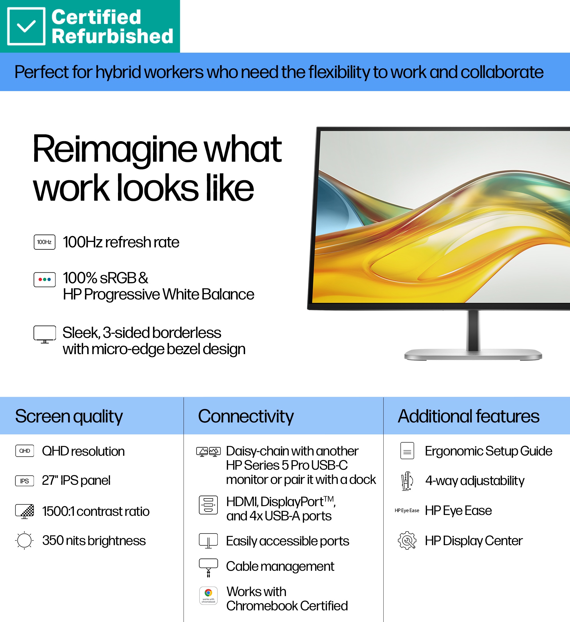 RENEW GOLD HP 527pq Series 5 Pro QHD Monitor - 27" 2560x1440 QHD 350-nit 100Hz AG, IPS, HDMI/DisplayPort, 4x USB-A, height adjustable/tilt/swivel/pivot, 1 years (replaces E27q G5)