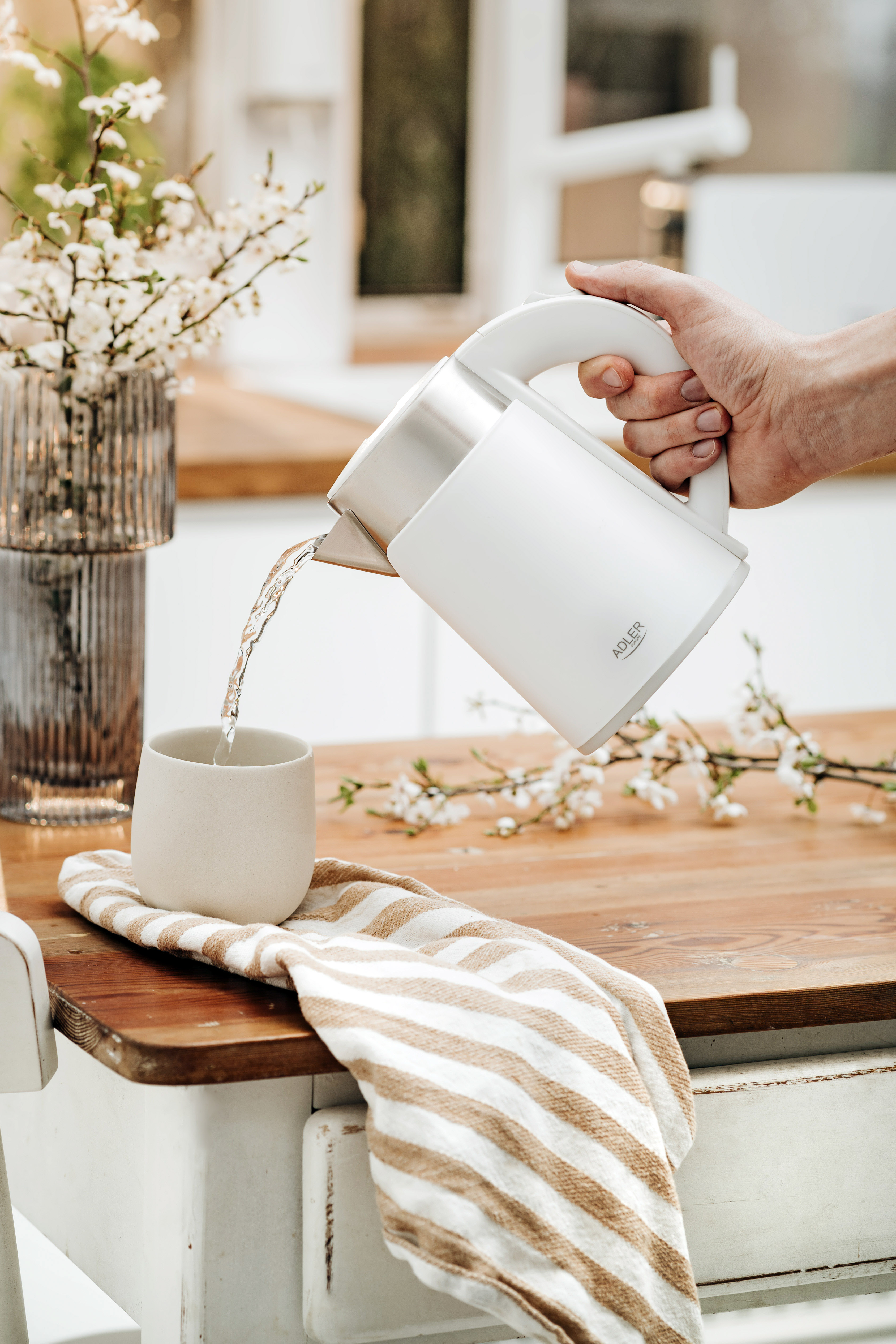 Double-wall housing. High grade flat stainless steel heating element. Automatic protection against boiled without water. Control lamp. Double housing kettle: stainless steel (inside), plastic (outside)