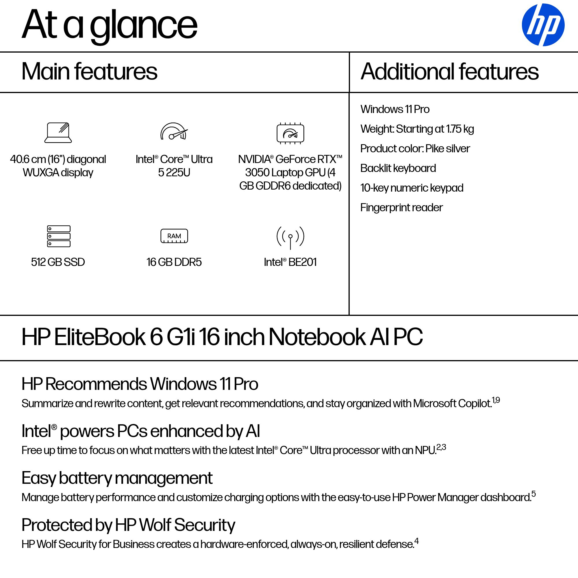 • Intel Core™ Ultra 5 225U (up to 4.8 GHz with Intel Turbo Boost Technology, 12 MB L3 cache, 12 cores, 14 threads) • Windows 11 Pro • 40.6 cm (16") diagonal WUXGA display • Intel Graphics