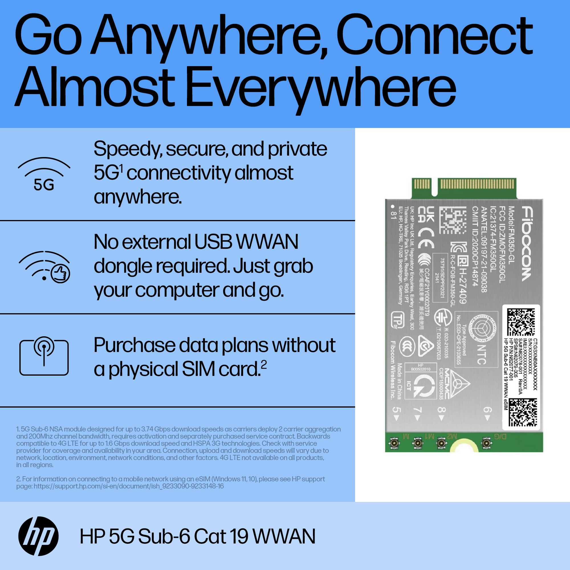 HP 5G Modem m.2 WWAN 4G/5G Sub-6 GHz FM350-GL Mobile Broadband Cellular (compatible with WWAN-ready EliteBook 830 835 840 845 860 865 1040 G11, x360 G11, ZBook Firefly Fury Power 14 16 G11 G11A)