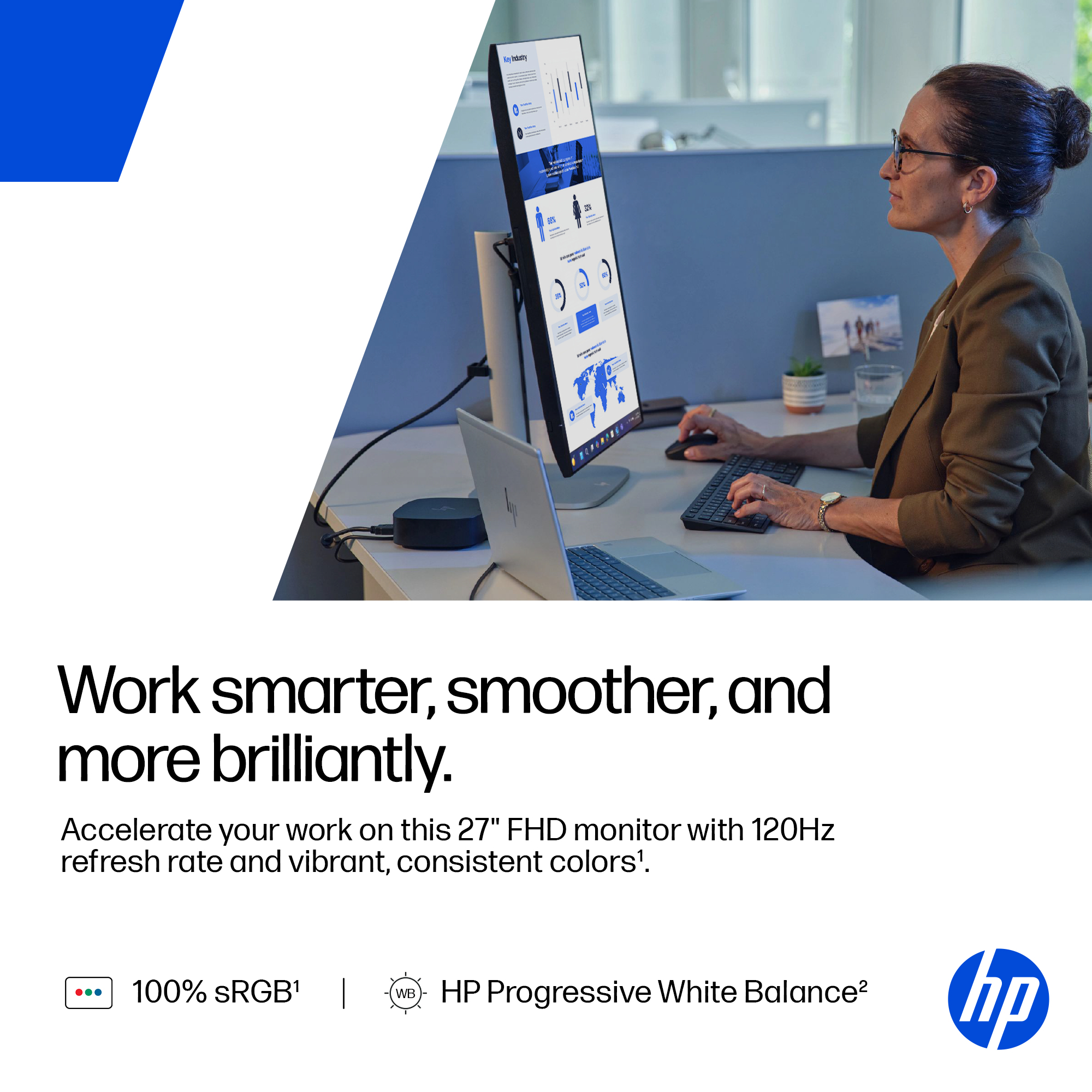 • Accelerate your work on this 27" FHD monitor with 120Hz refresh rate[1] . Experience vibrant, consistent colors with 100% sRGB[1] and HP Progressive White Balance[2].