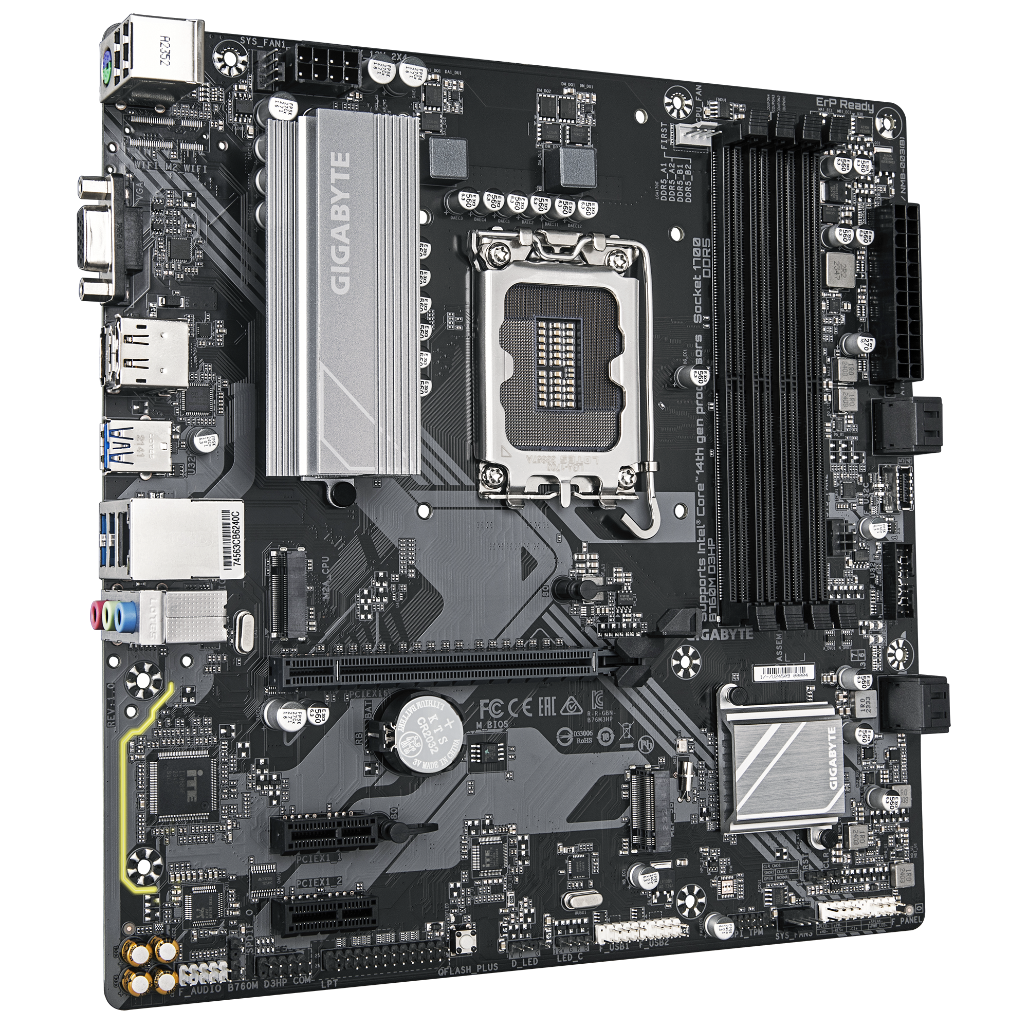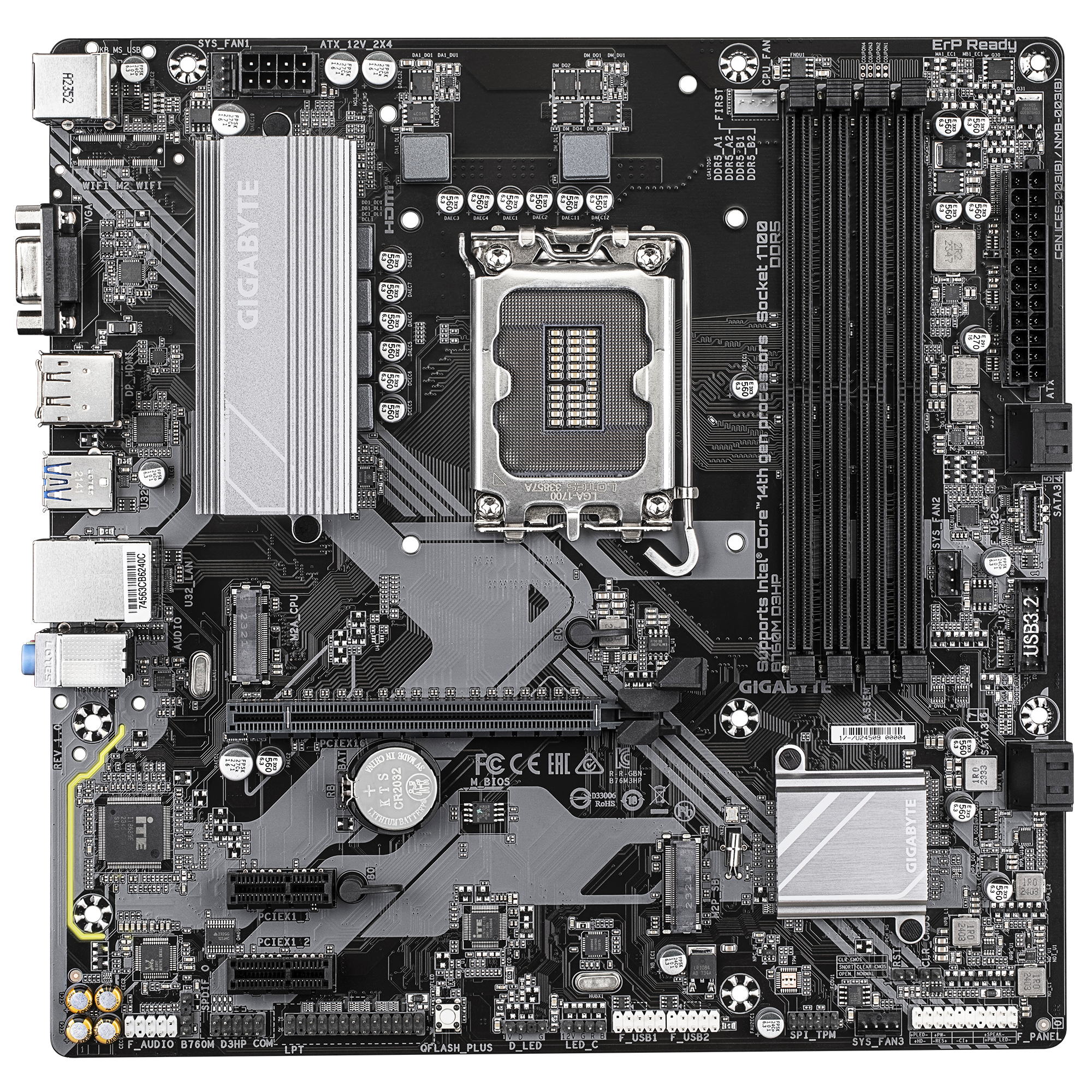 Gigabyte B760M D3HP | Processor family Intel | Processor socket LGA1700 | DDR5 | Supported hard disk drive interfaces M.2, SATA | Number of SATA connectors 4