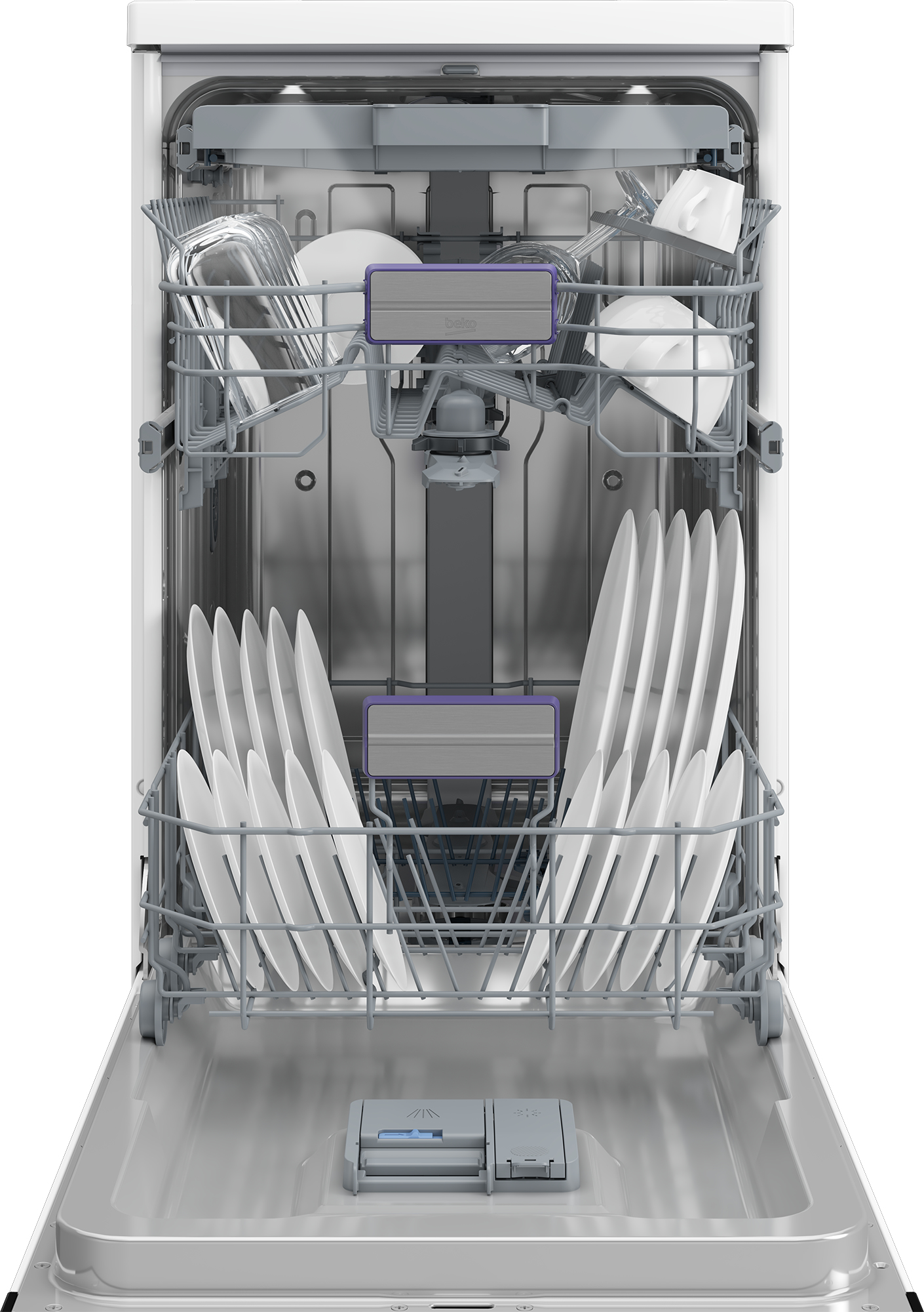 • White Slimline (45 cm) Freestanding • 11 place settings • Energy efficiency class: E • Energy consumption per 100 cycles: 81 kWh • Noise emission class: C 46 dB