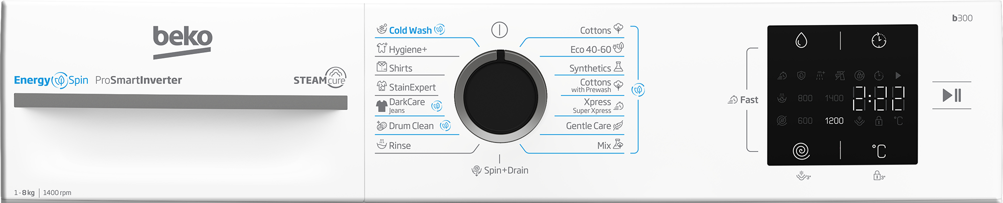 • Freestanding Front-load 8 kg 1400 RPM White • Built-in display • Cold, Cotton, Delicate/silk, Hygiene+, Jeans/denim, Mix, Pre-wash, Quick, Quick 14min, Synthetics, Wool • AquaStop function Load balancing system