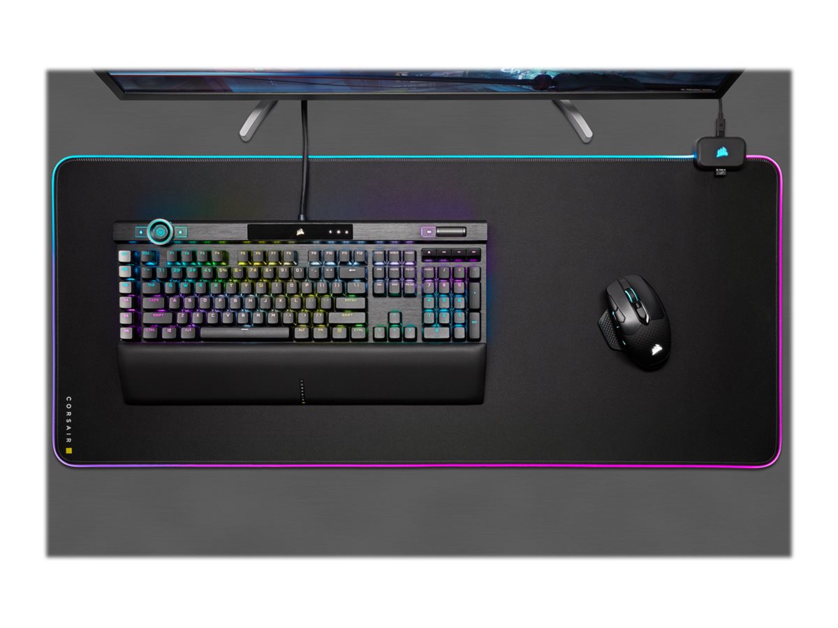 The CORSAIR MM700 RGB Extended Cloth Gaming Mouse Pad provides an expansive surface with ample room for your peripherals, surrounded by 360° of three-zone dynamic RGB lighting.