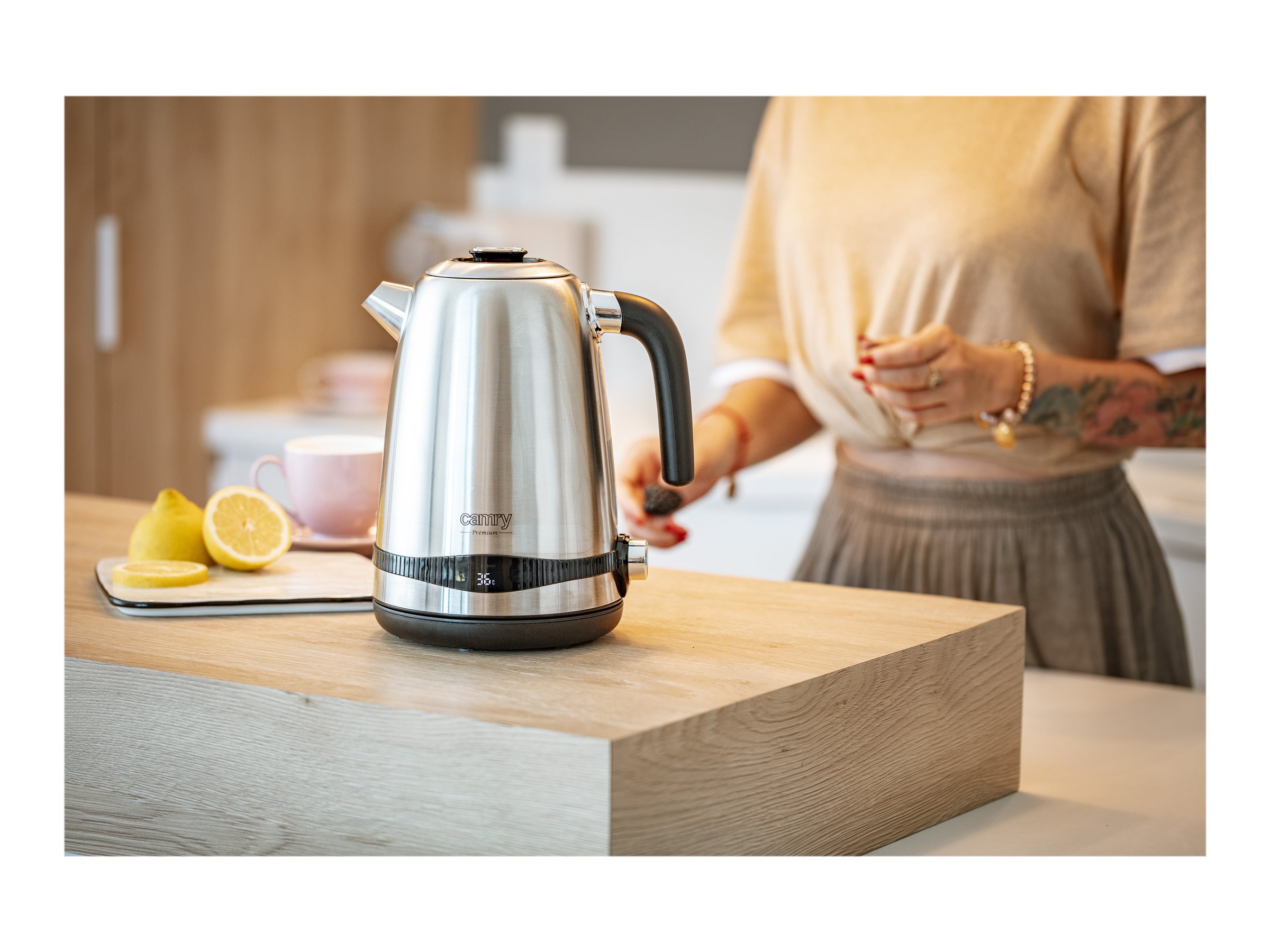 Electric kettle with LCD display & temperature regulation; LCD temperature display; Adjustable cooking temperature 40-50-60-70-80-90-100°C; Keep warm function 40-50-60-70-80-90-100°C; Beep when starting and after boiling; 2 hours keep warm function; Completely removable lid for easy cleaning