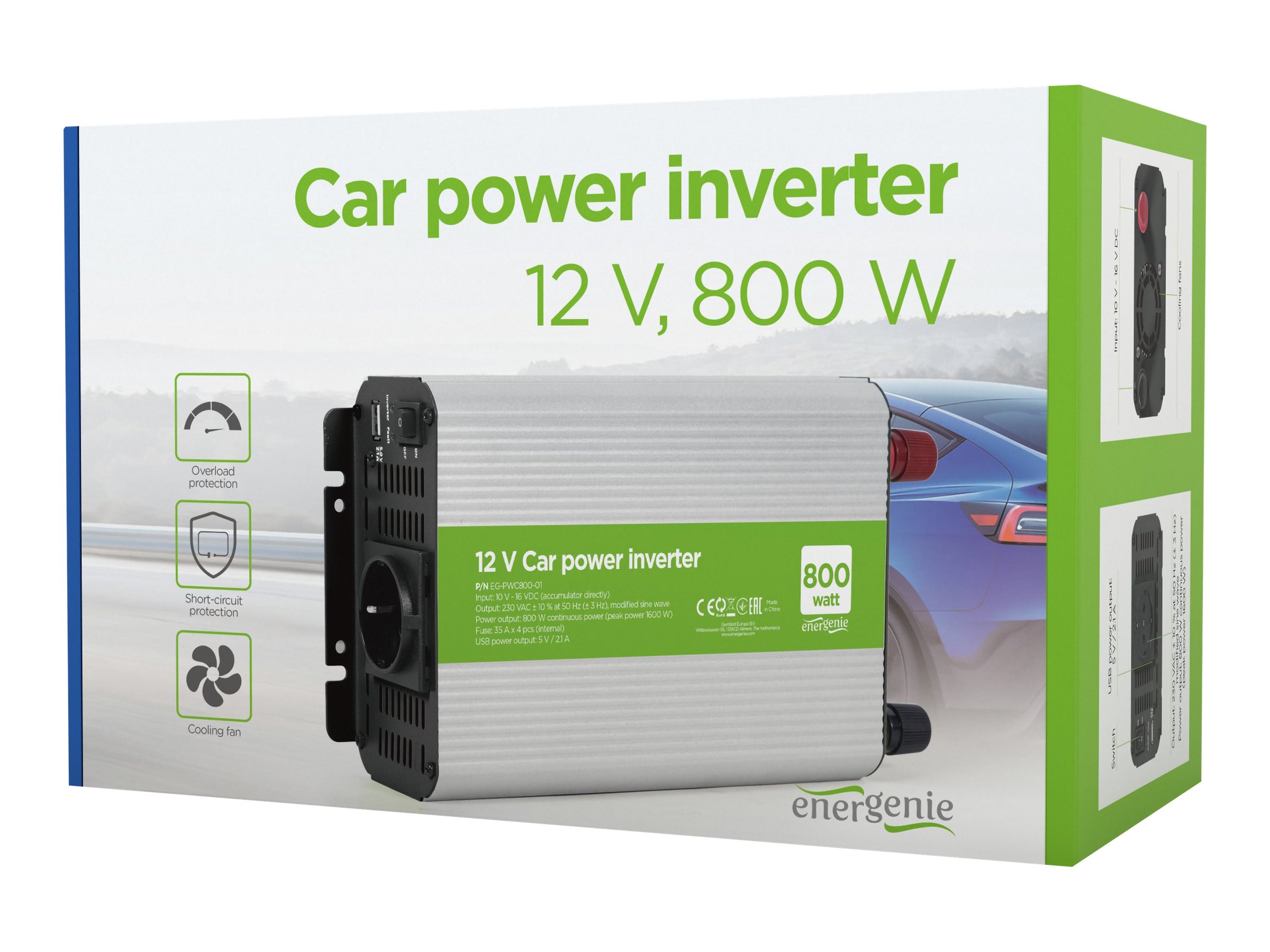 Allows to connect any AC powered electronics (max. 800 Watt), like notebooks, HiFi or video equipment, chargers of mobile phones/cameras, electrical tools etc.