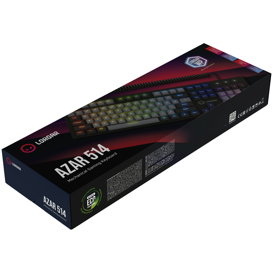 LORGAR Azar 514, Wired mechanical gaming keyboard, RGB backlight, 1680000 colour variations, 18 modes, keys number: 104, 50M clicks, linear dream switches, spring cable up to 3.4m, ABS plastic+metal, magnetic cover, 450*136*39mm, 1.17kg, black, EN layout