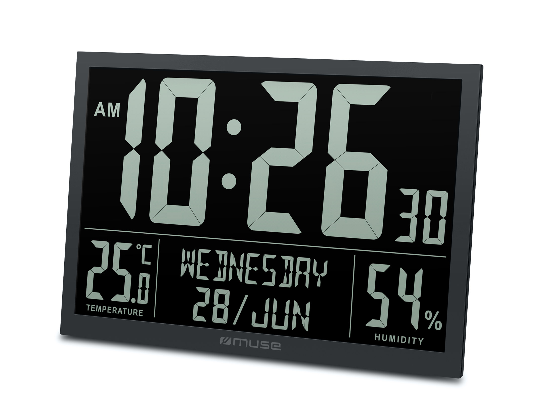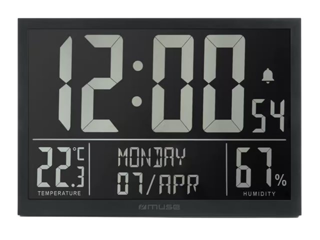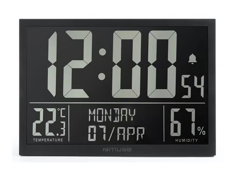| Funkcijas | Full digits display of day of week and 3 digits display of month, Temperature & humidity, Calendar, alarm and clock function, Wall mount or table stand design |