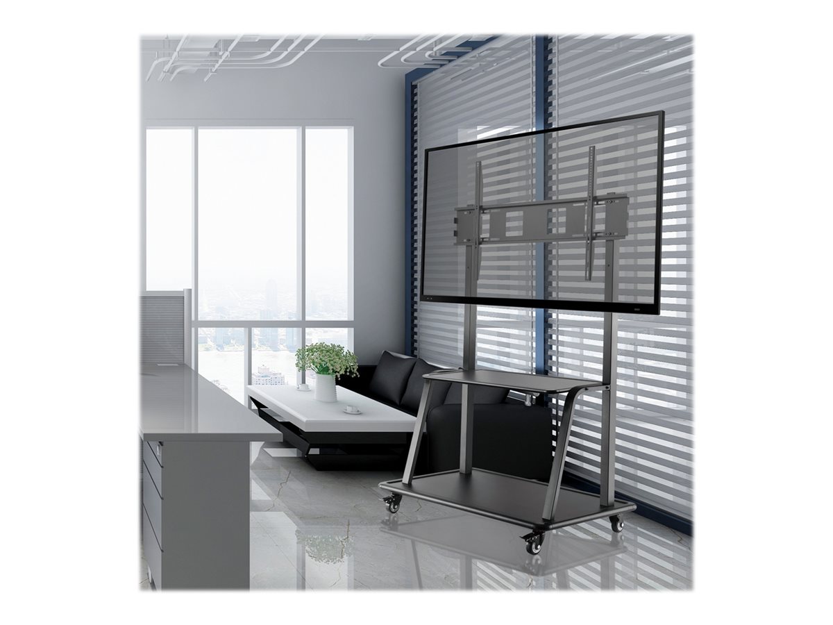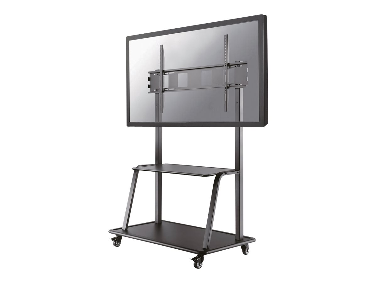 The Neomounts floor stand, model NS-M4000BLACK is a mobile floor stand for flat screens up to 105" (267 cm). This mobile stand is a great choice for space saving placement or when wall-, ceiling mounting or desk placement is not an option. This cart stretches your investment by serving a variety of projection needs by sharing a large display over multiple rooms. Get optimal positioning for both standing and seated audiences, in any application, in any part of your location. The mount is manually height adjustable. Neomounts' floor stand, NS-M4000BLACK holds your TV, AV equipment and even hides your cables. The casters allow the stand to move it to where you need it. Easily roll this cart through doorways and over thresholds. The trolley features four solid castor wheels, of which the two front wheels are equipped with a brake. The floor stand also comes with four leveling feet. Neomounts NS-M4000BLACK is suitable for screens up to 105" (267 cm). The weight capacity of this product is 150 kg each screen. The stand is suitable for screens that meet VESA hole pattern 200x200 to 1000x600mm. All installation material is included with the product.