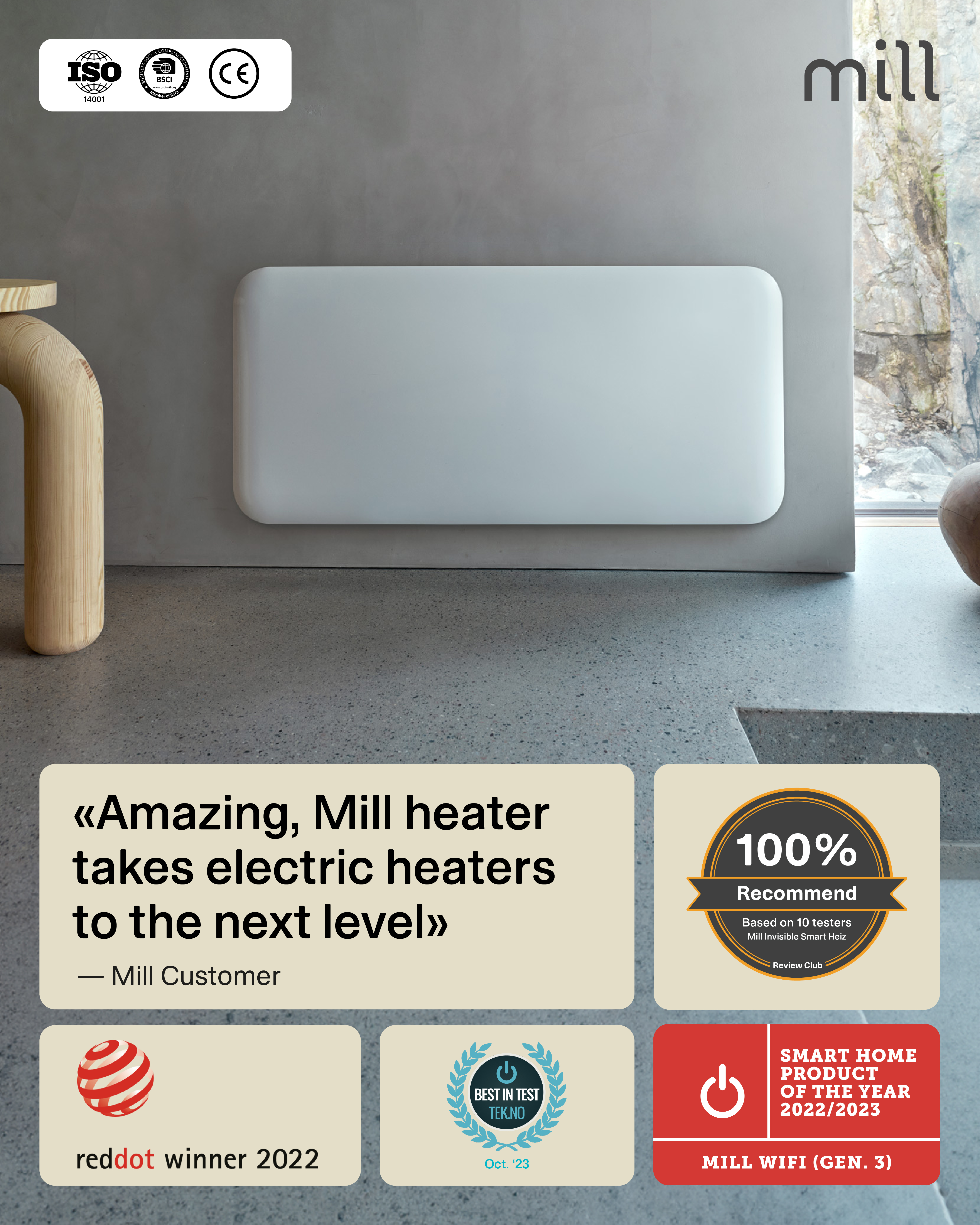 | Īpašās funkcijas | LED Display for easy reading; Easy connection to WiFi via Bluetooth 5.2; Low energy control; Mill PID Wattage Tech; Mill Predictive Heating; Silent operation; Child safety lock; Overheat protection |