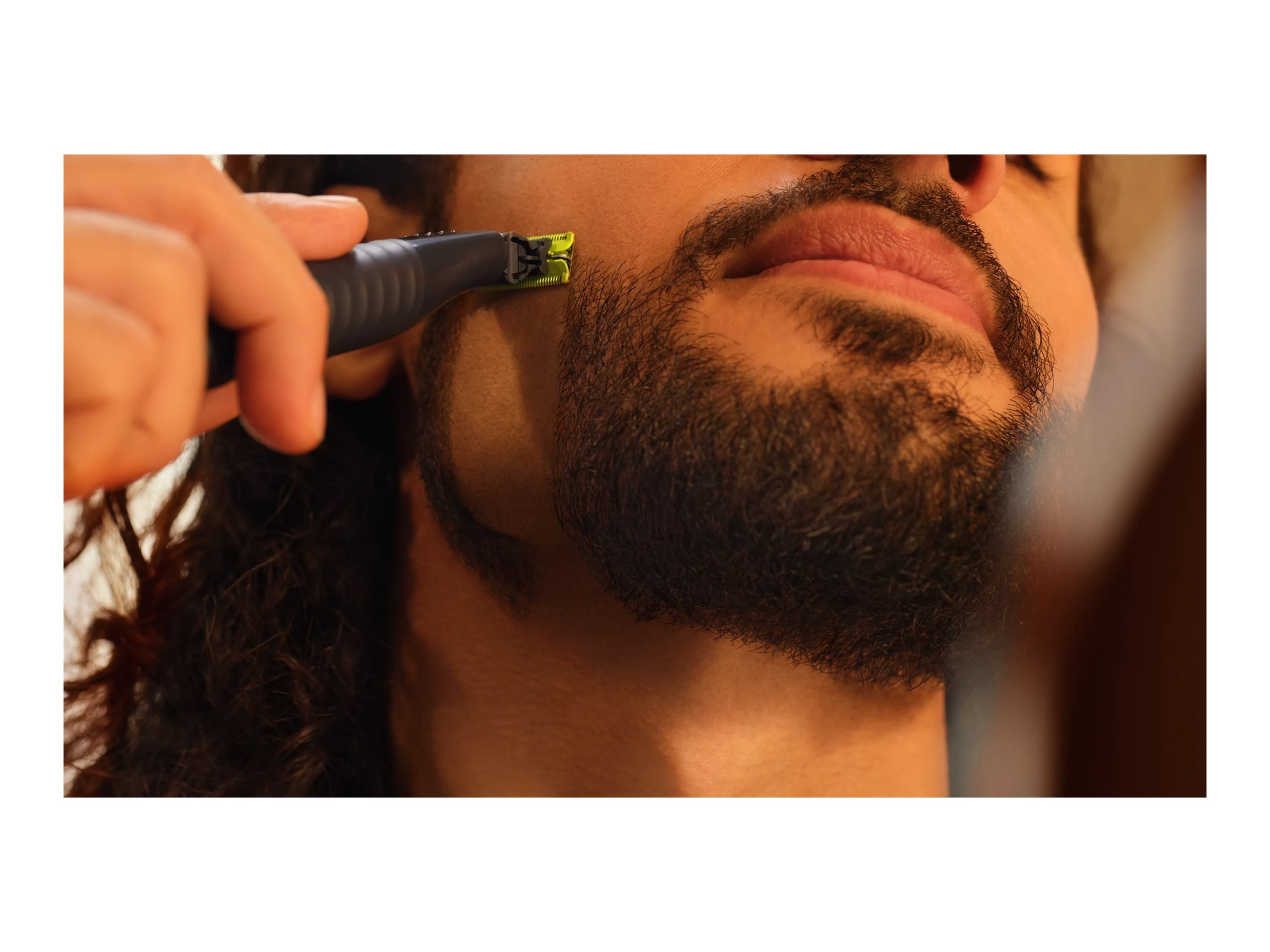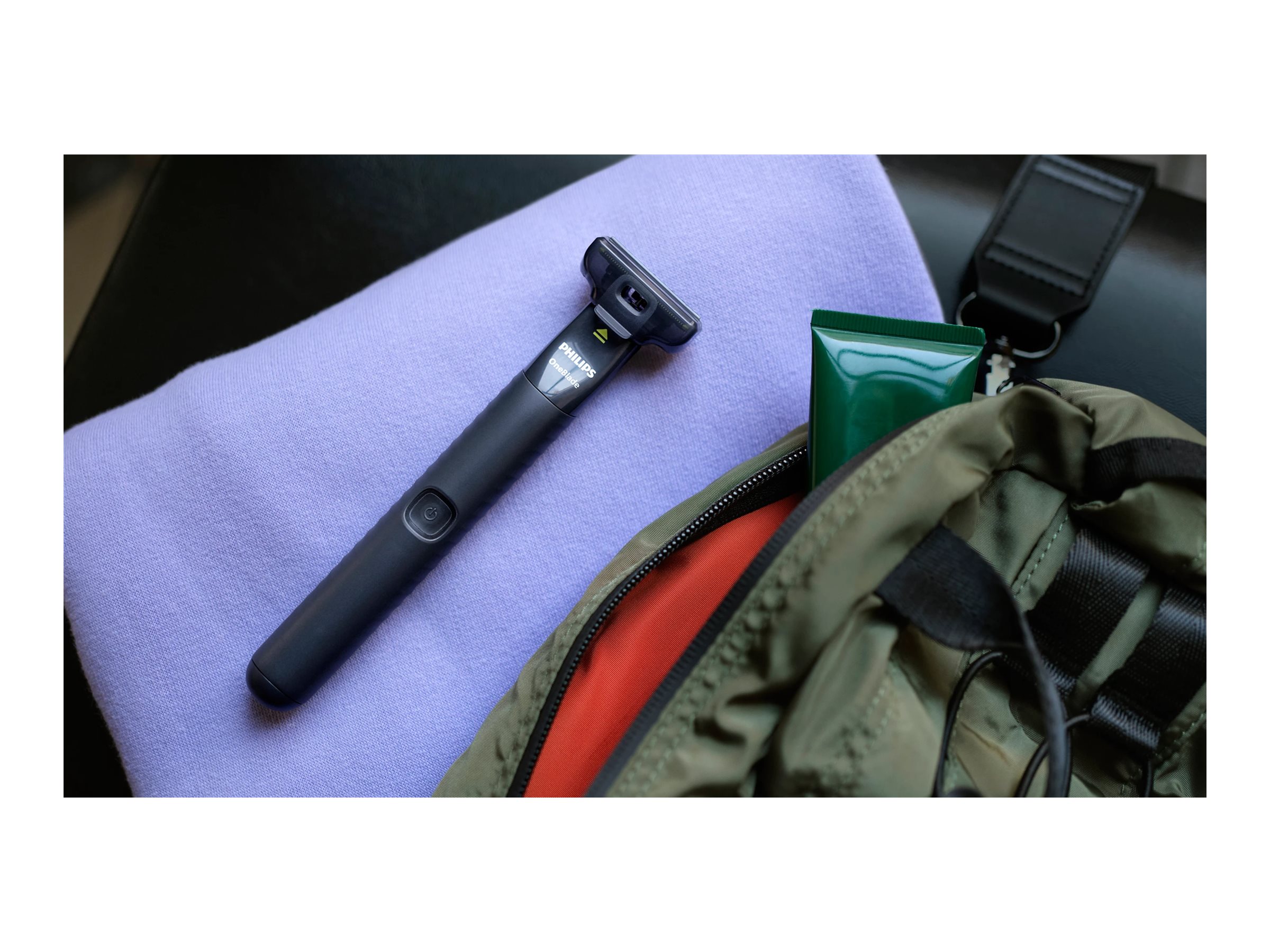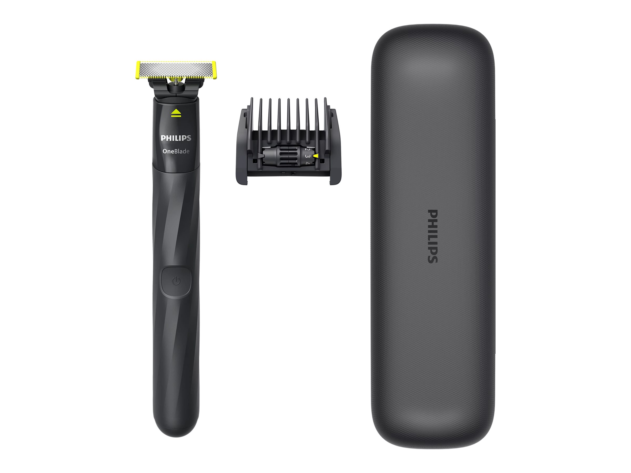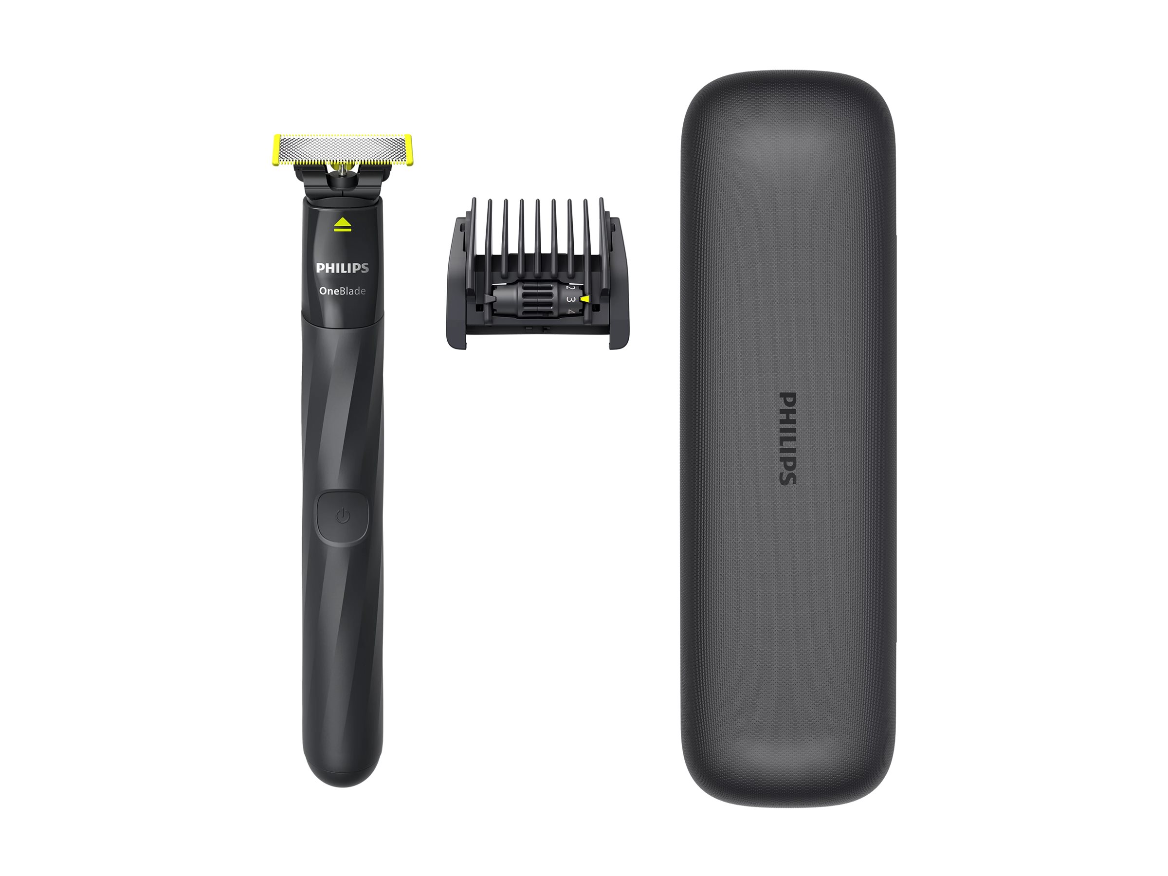 • Premium travel case • Wet and dry • Long lasting battery • Dual-sided blade • Blade that doesn't become blunt easily • USB-A charging • Shave it off (Face) • Unique OneBlade Technology