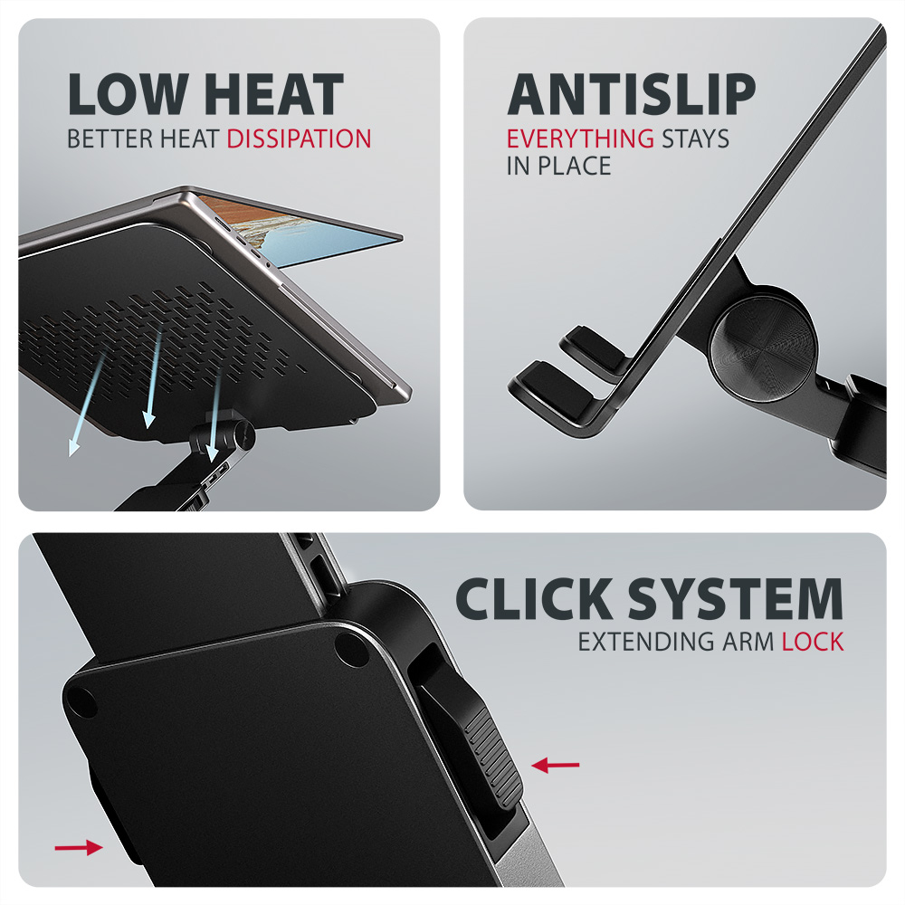 Lightweight and strong metal construction; Anti-slip finish, which also protects the device from scratches; Swivel arm mechanism (360° around its axis); Many adjustable positions; Laptop surface tilt adjustment (0–180°); Arm tilt adjustment (0–180°)