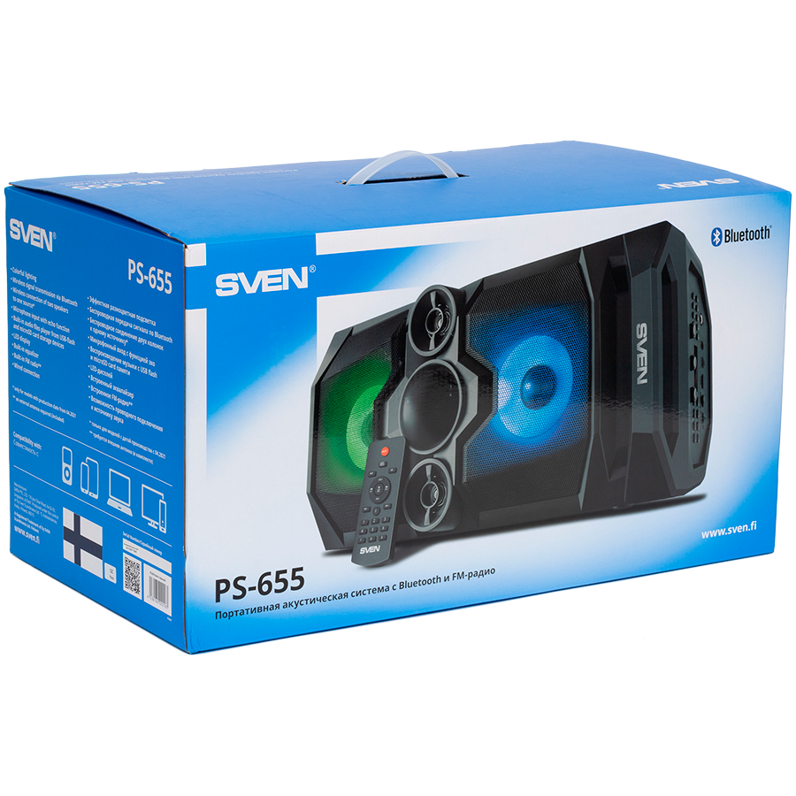 SVEN PS-655 2x25W; LED display; TWS; FM radio; AUX; USB/SD-card support;Lighting; Microphone input (karaoke); Remote Control; Built-in equalizer