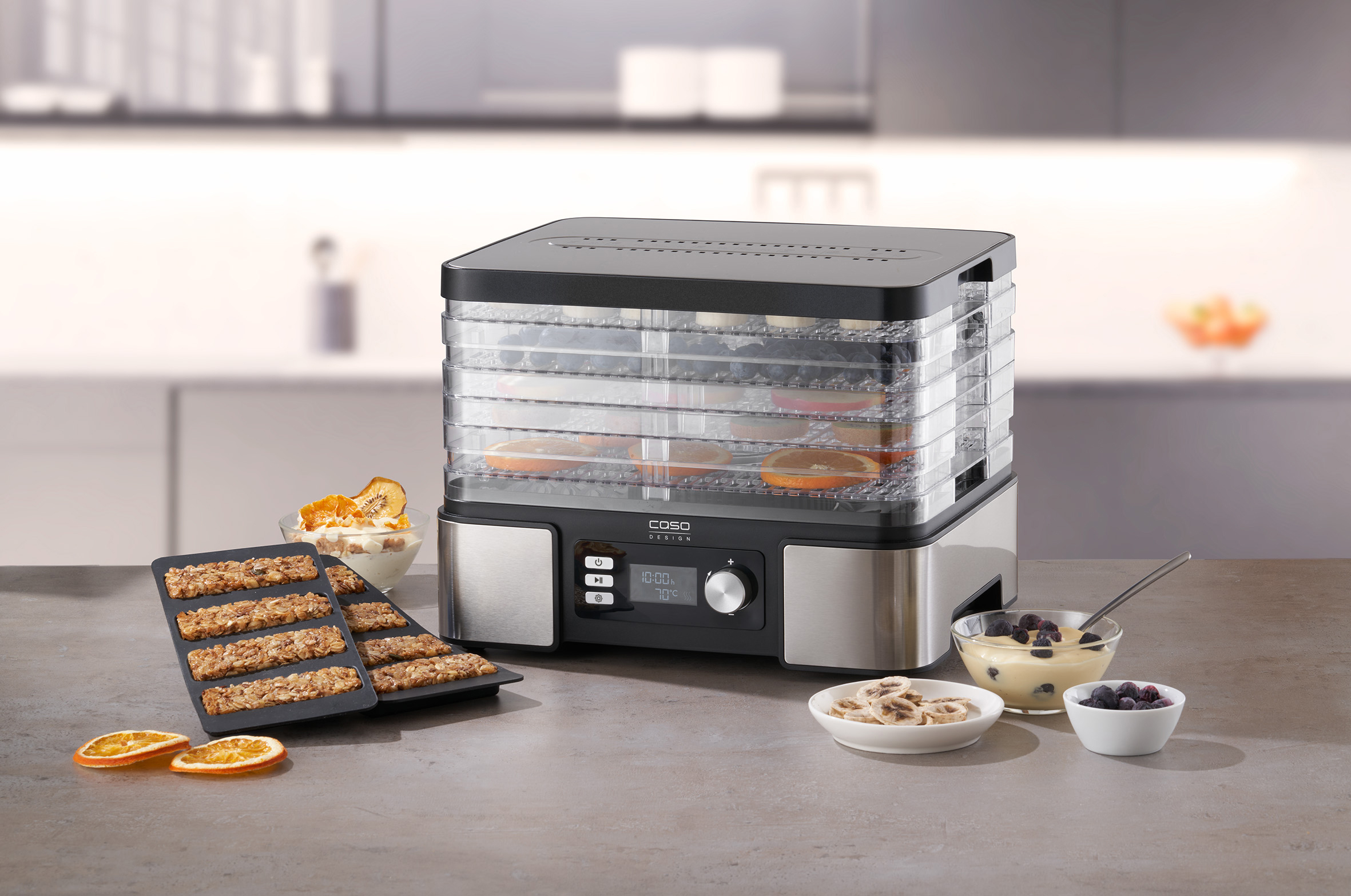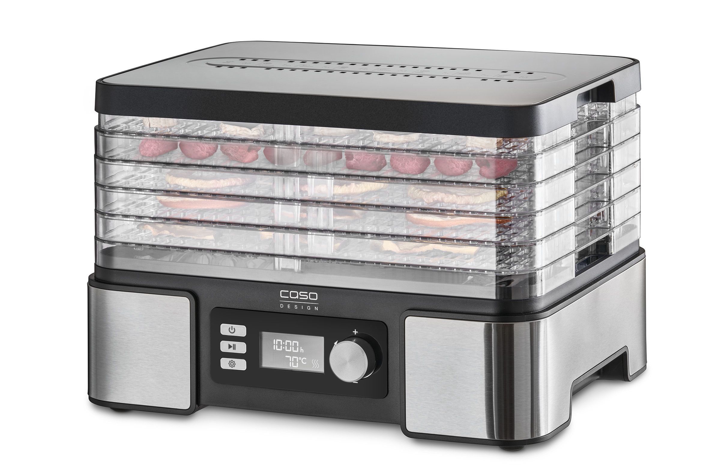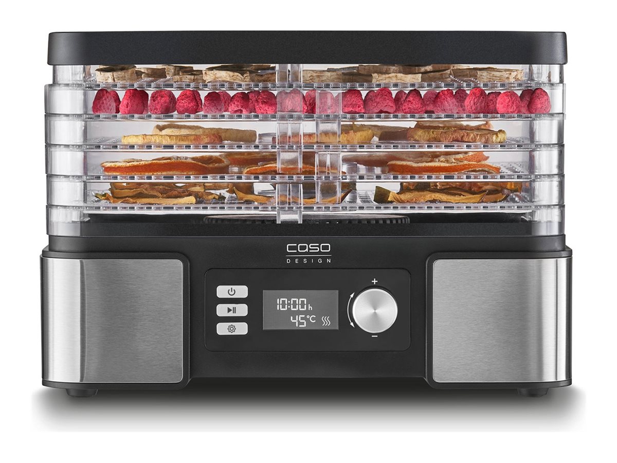 White LED screen with temperature and time display; Cover and base in high-quality stainless steel; Practical timer adjustable from 0.5 ‐ 48 hours (in 0.5 h increments) with acoustic signal when the time is up; Plenty of space thanks to 5 stackable, height-adjustable drying racks