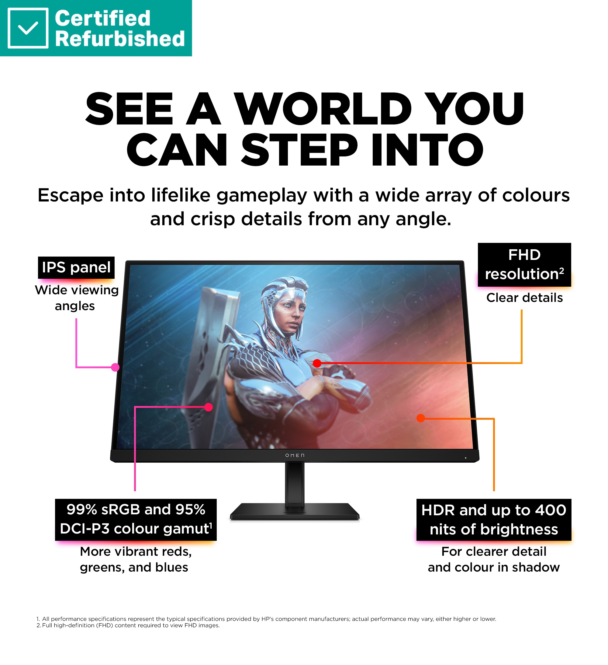 • Frame by frame, experience all the action with 1ms GTG response time with Overdrive and 165Hz refresh rate coupled with AMD FreeSync™ Premium technology[2].