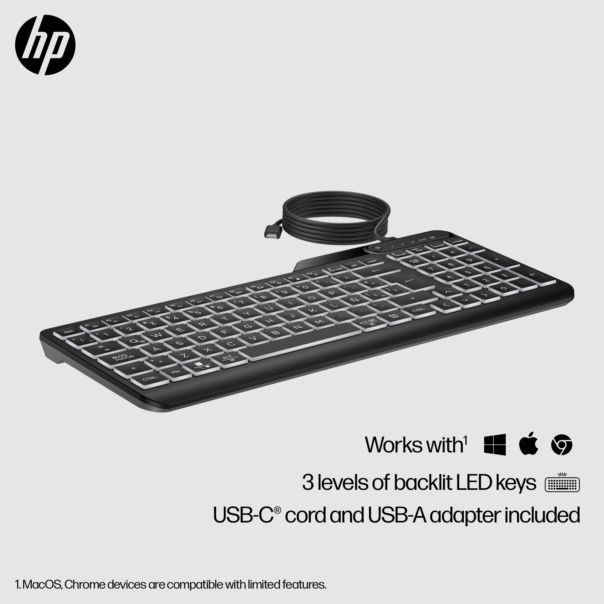 HP 405 Backlit USB-C Wired 24/7 Keyboard, Spill Resistant, Sanitizable, Programmable, Adjustable Tilt and LED brightness - Black - US ENG
