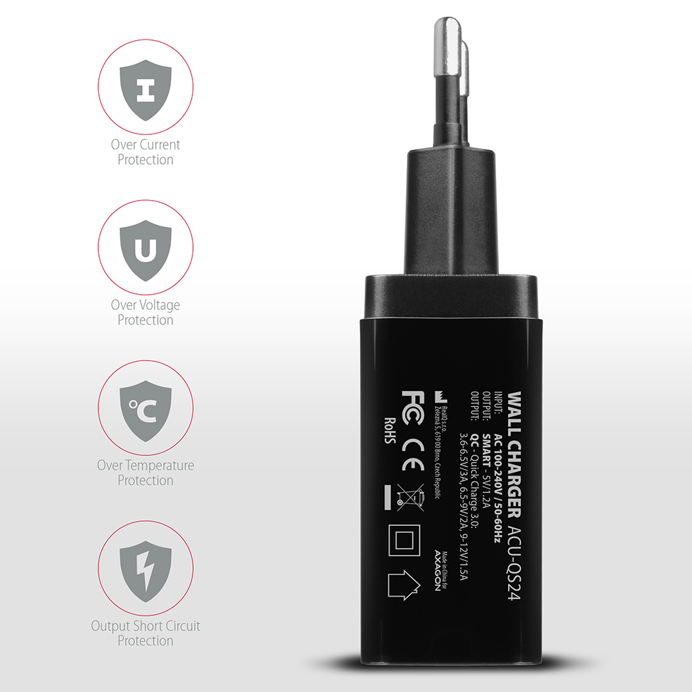 AXAGON Dual wallcharger 240V/2x USB port QC3.0/AFC/FCP and 5V-1.2A, 24W | ACU-QS24