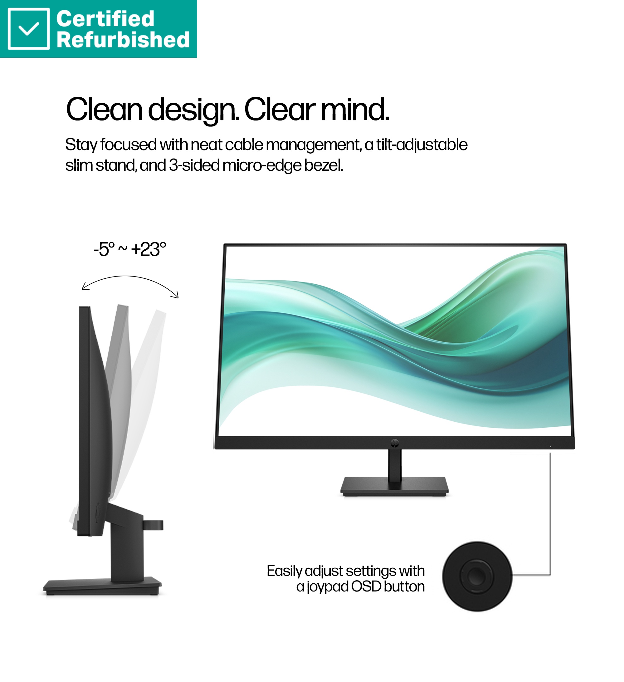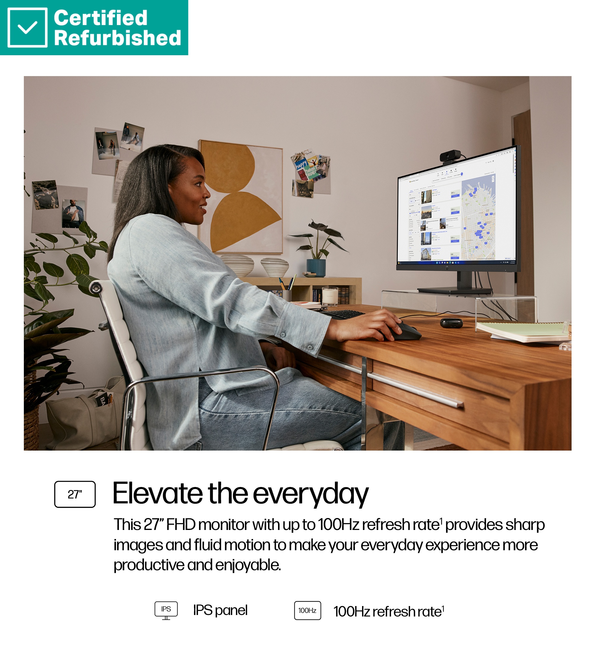 • This 27" FHD monitor with up to 100 Hz refresh rate[1] provides sharp images and fluid motion to make your everyday experience more productive and enjoyable.