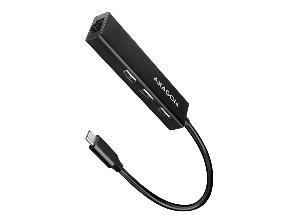 Slim metal USB-C 3.2 Gen 1 (USB 3.0) multi-port hub AXAGON HMC-GL3A connects up to three USB devices to laptop or computer and also adds Gigabit network card which connects your computer to high speed network.