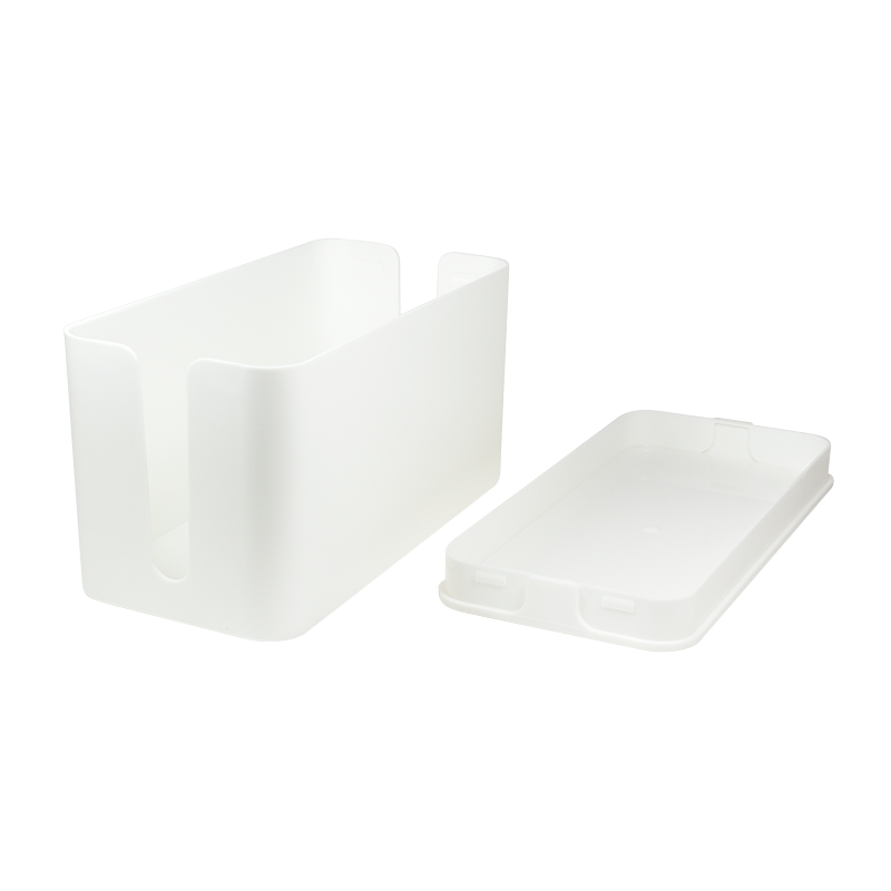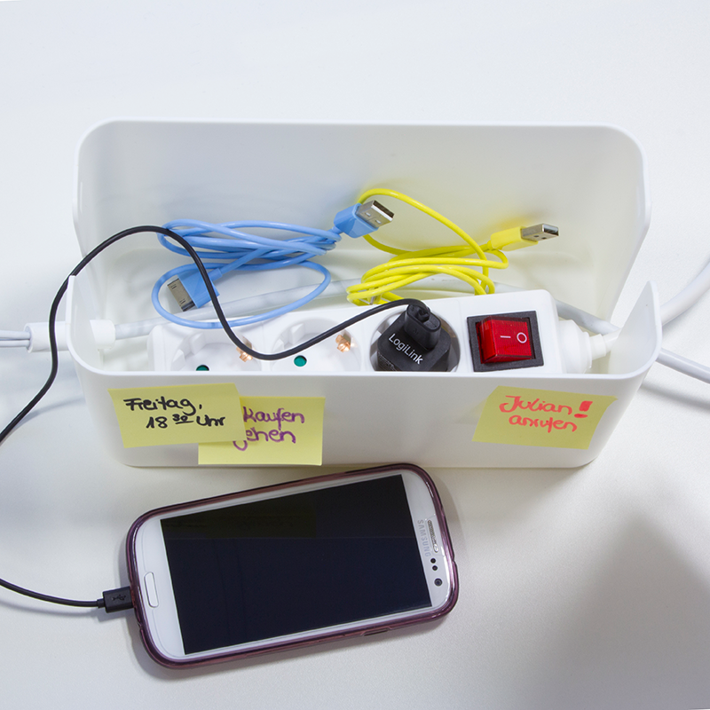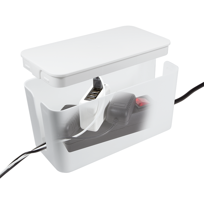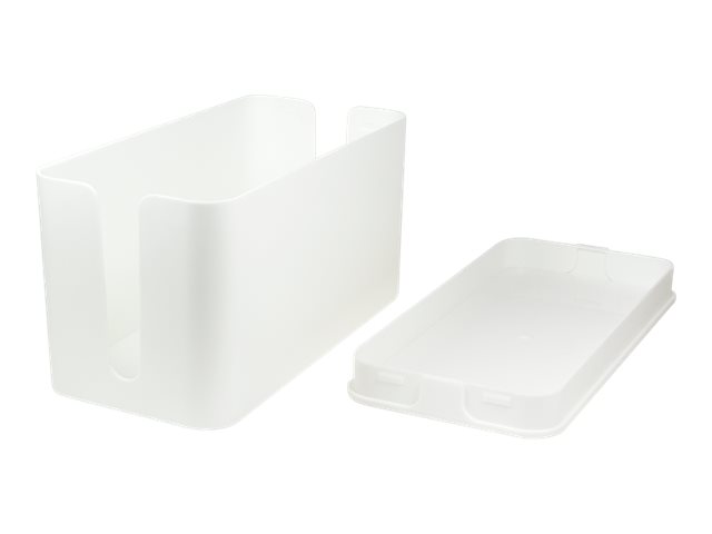 To hide tangled cables Plastic box Opening for cables on both sides For an organized office and a tidy home Size: 235 x 115 x 120 mm Color: White