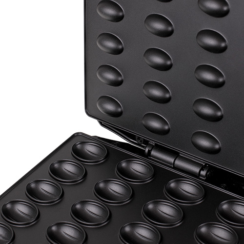 Non-stick coating plates. Fast baking up to 2 minutes in one cycle. Bakelite housing. Cool touch handles. Cover with latch. Control lamp. Non-slip feet.