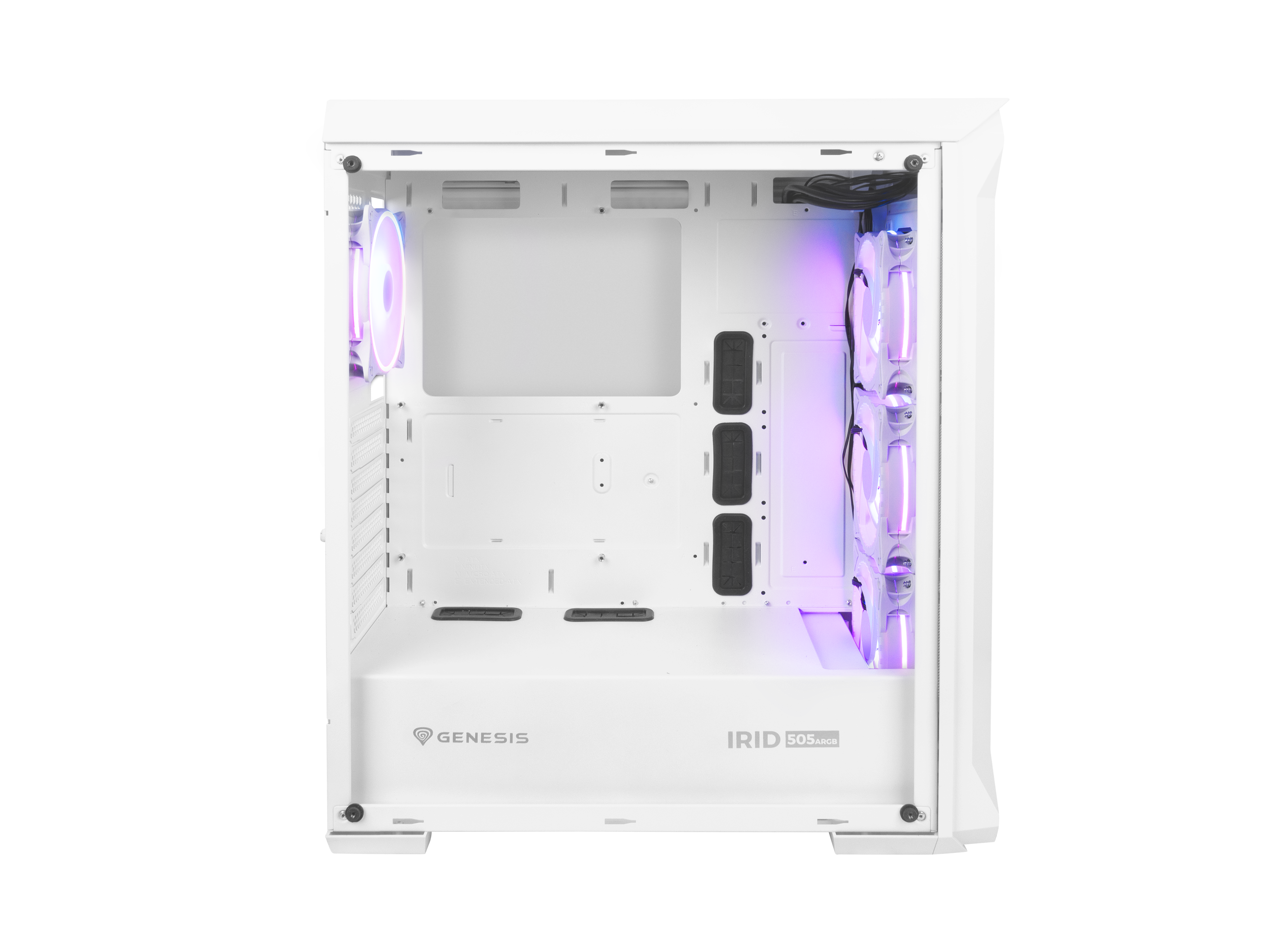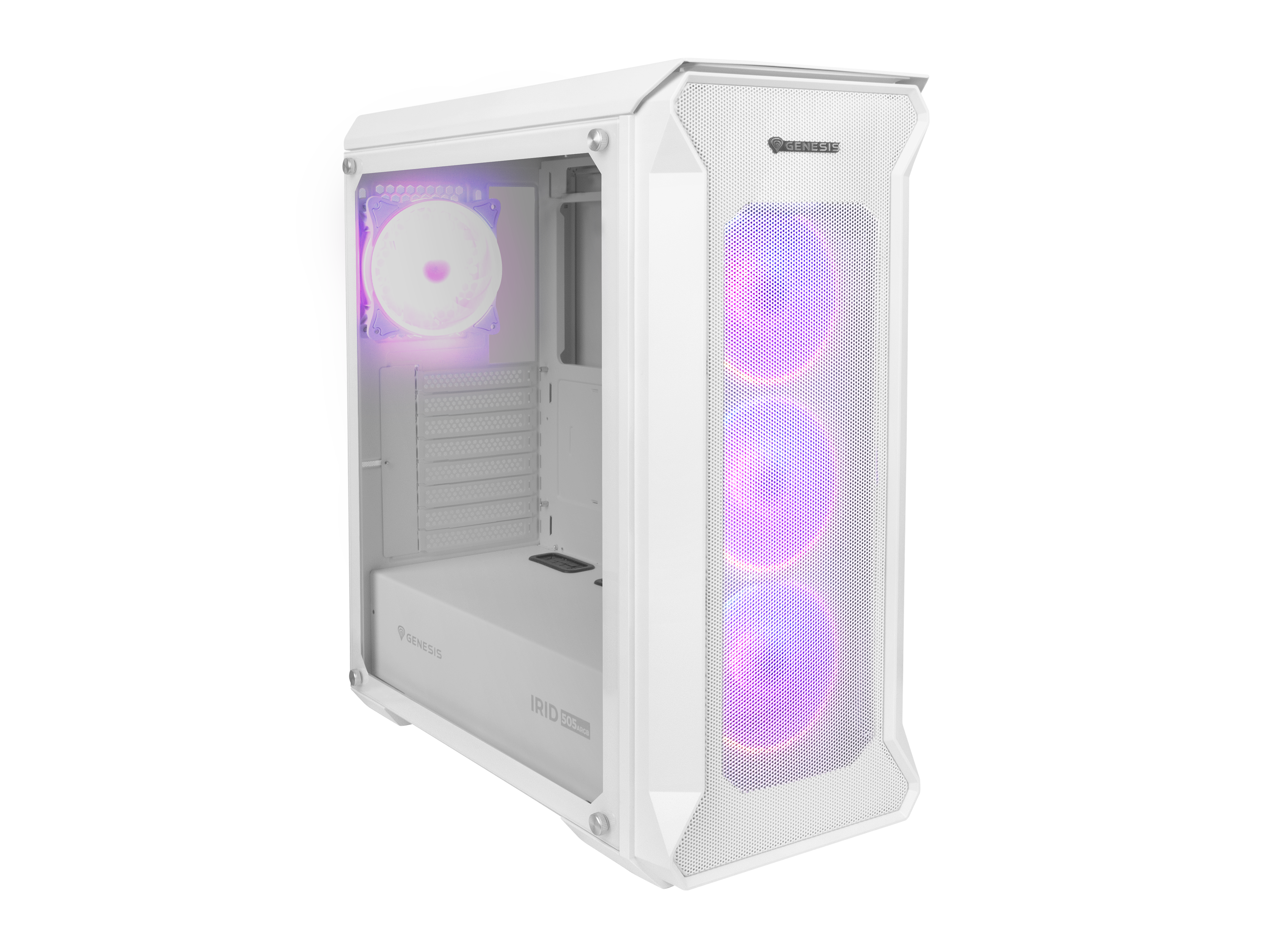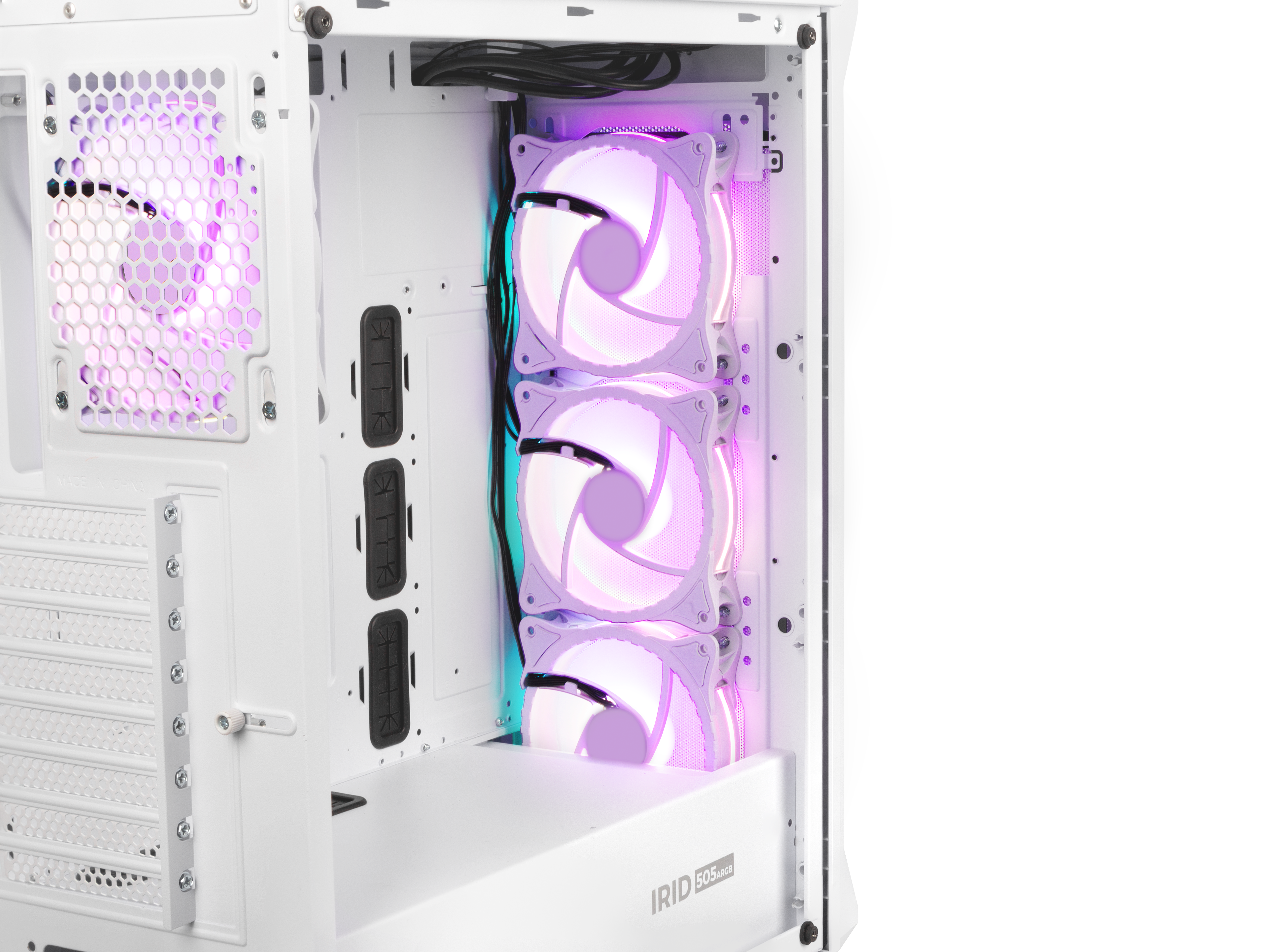 Irid 505 ARGB has a perforated front, and the side panel is made of transparent tempered glass, which allows you to keep an eye on the working components; Can attach up to five SSDs; The case is equipped with four robust and very quiet 120mm ARGB fans with the ability to mount up to two more