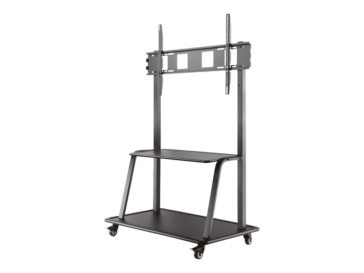 The Neomounts floor stand, model NS-M4000BLACK is a mobile floor stand for flat screens up to 105" (267 cm). This mobile stand is a great choice for space saving placement or when wall-, ceiling mounting or desk placement is not an option. This cart stretches your investment by serving a variety of projection needs by sharing a large display over multiple rooms. Get optimal positioning for both standing and seated audiences, in any application, in any part of your location. The mount is manually height adjustable. Neomounts' floor stand, NS-M4000BLACK holds your TV, AV equipment and even hides your cables. The casters allow the stand to move it to where you need it. Easily roll this cart through doorways and over thresholds. The trolley features four solid castor wheels, of which the two front wheels are equipped with a brake. The floor stand also comes with four leveling feet. Neomounts NS-M4000BLACK is suitable for screens up to 105" (267 cm). The weight capacity of this product is 150 kg each screen. The stand is suitable for screens that meet VESA hole pattern 200x200 to 1000x600mm. All installation material is included with the product.