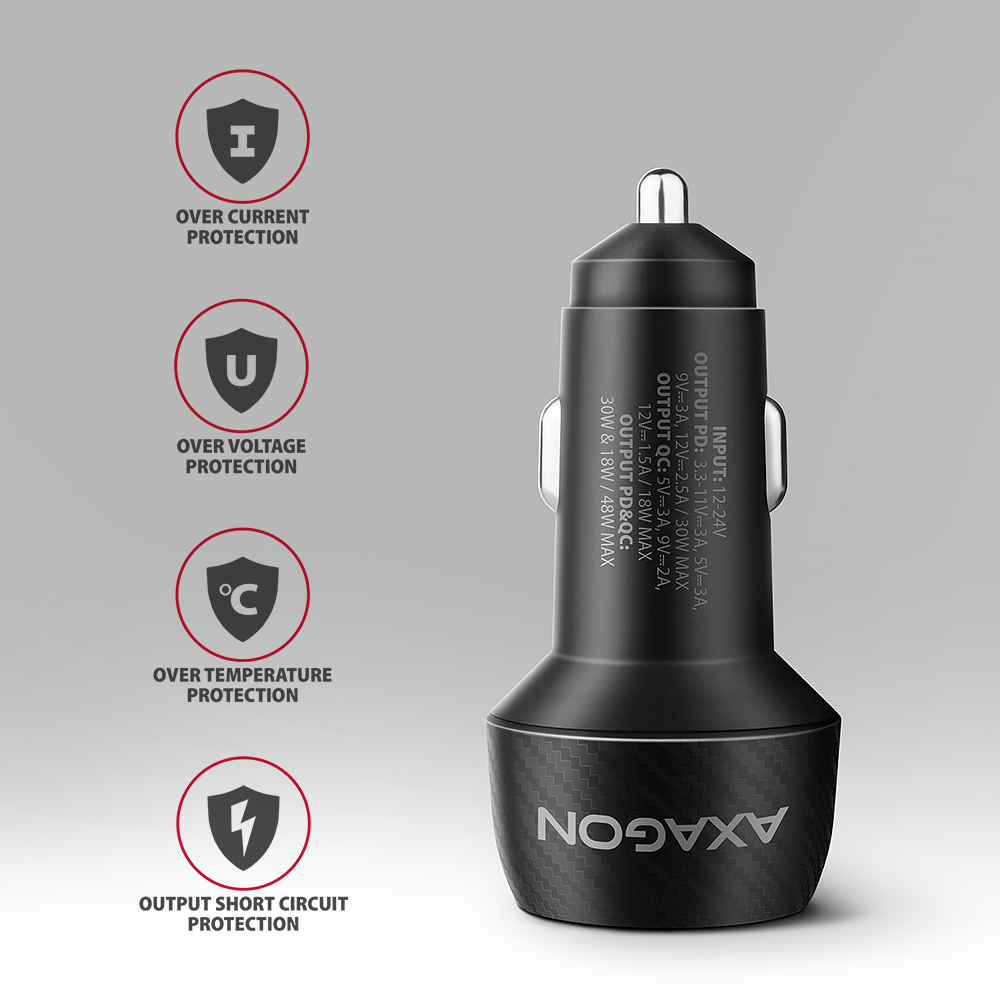 The universal car charger AXAGON PWC-PQ48 enables fast charging of up to two mobile devices simultaneously conveniently on the go. Thanks to the total power of 48W, the charger can charge a phone and tablets at the highest possible speed. The adapter offers not only a standard USB-A connector, but also a reversible USB-C connector.